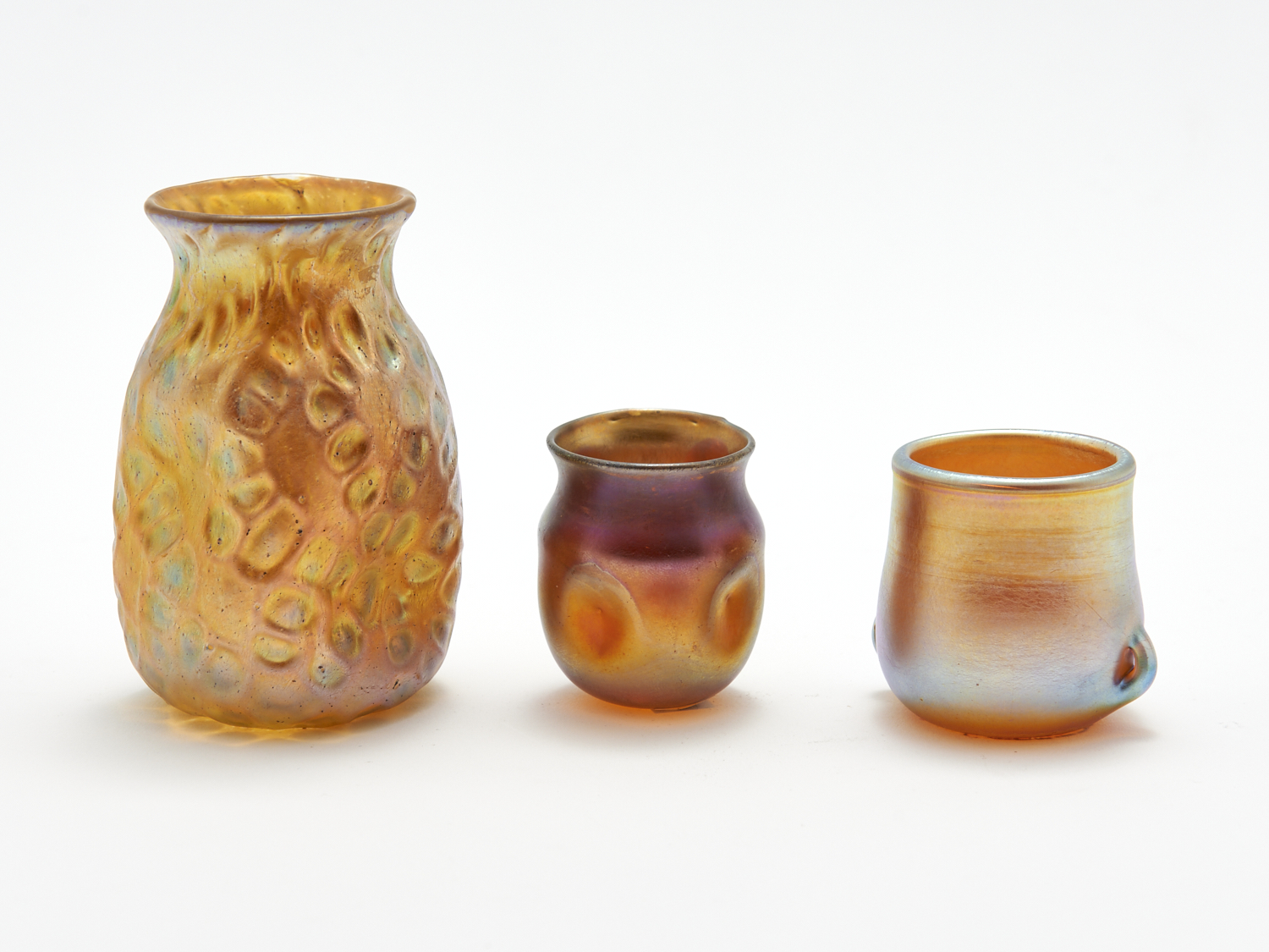 THREE SMALL LUSTRE GLAZE VASES INCLUDING TIFFANY FAVILLE H.9CM (TALLEST) (A/F), LEONARD JOEL DELIVERY SIZE: SMALL