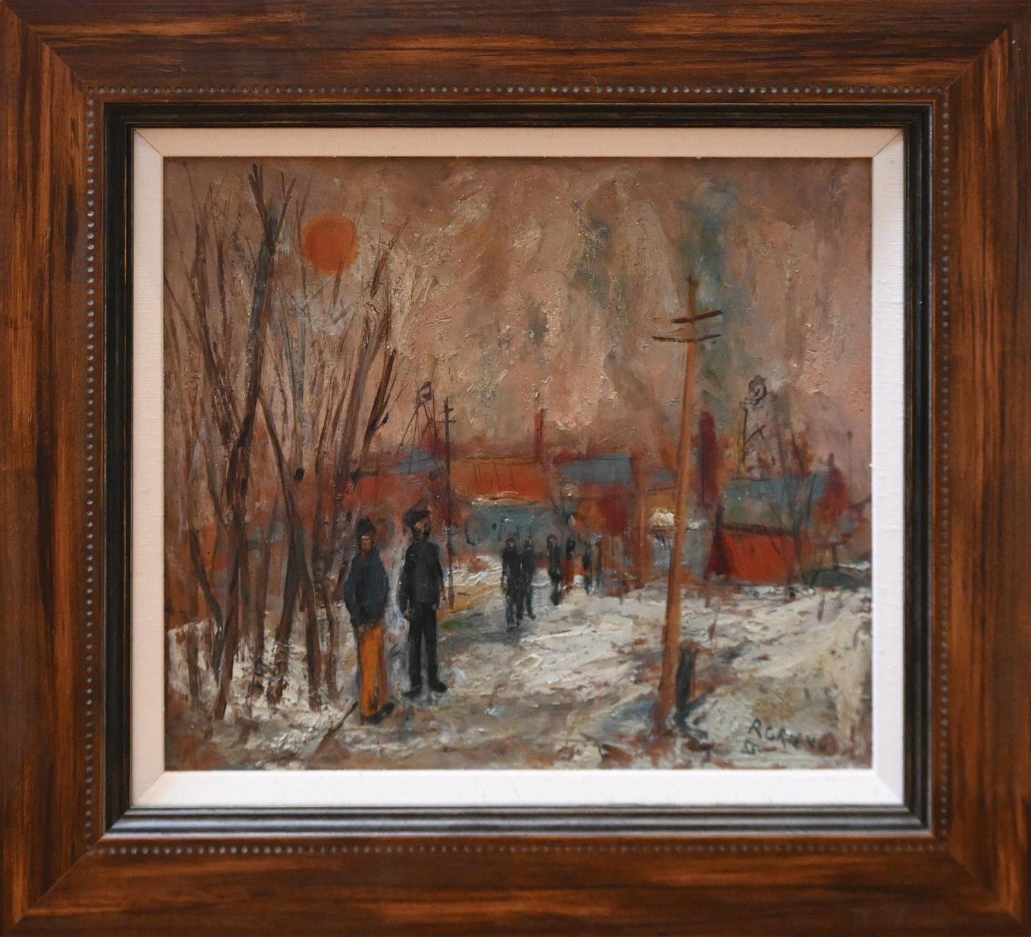 ROBERT GRIEVE, MORNING MINING 1955, OIL ON BOARD, SIGNED AND DATED LOWER RIGHT, 28 X 32.5CM, FRAME SIZE: 43 X 48CM