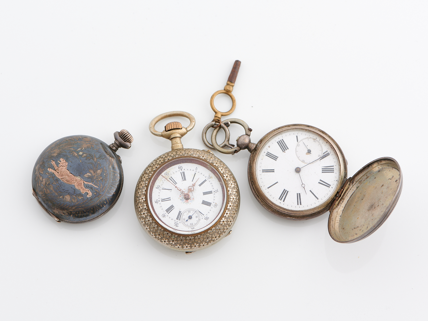 A COLLECTION OF THREE POCKET WATCHES, INCLUDING ONE OPEN FACE WATCH WITH FLOWER DECORATION, AND A HUNTING CASED WATCH WITH HORSE AND BEAST