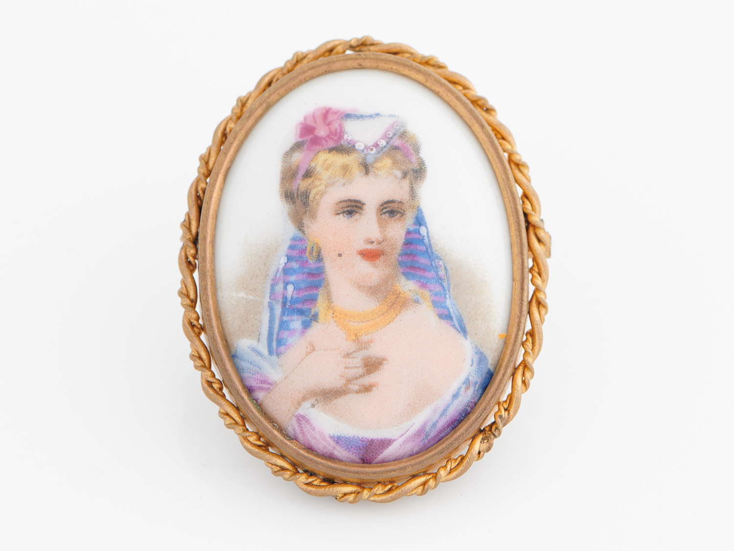 LIMOGES FRANCE, A PORCELAIN BROOCH FEATURING A HAND PAINTED PORTRAIT OF A LADY, TO A FRAME IN GOLD PLATE, 53 X 40MM
