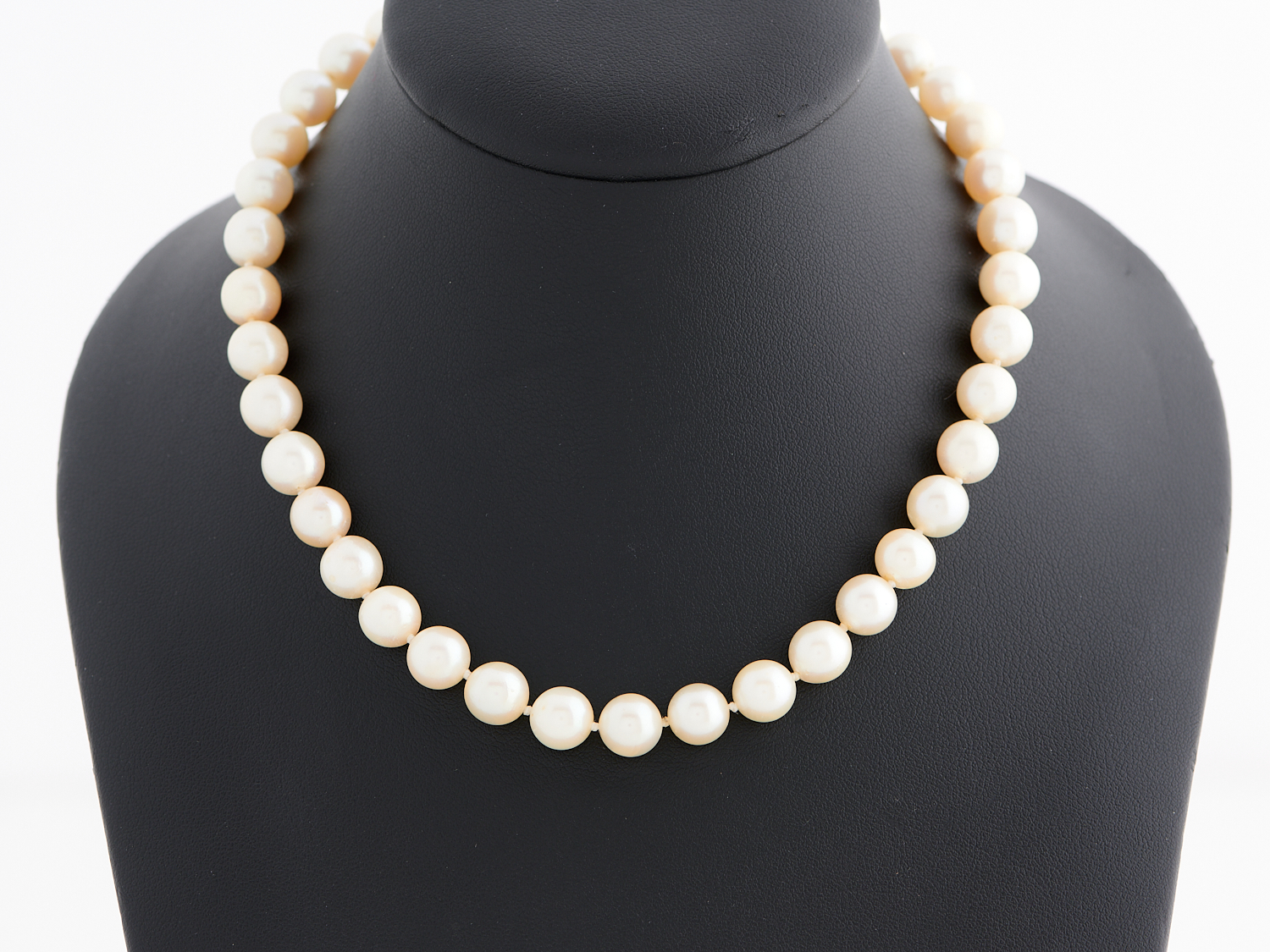 A STRAND OF CULTURED PEARLS, THE PEARLS OF APPROXIMATELY 8.6MM, LENGTH 360MM, TO A CLASP IN SILVER TONE METAL