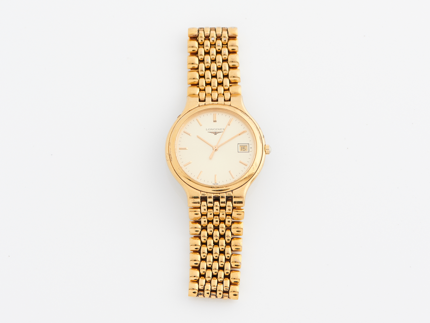 LONGINES, A VINTAGE LE GRANDES CLASSIQUES BRACELET WATCH IN GOLD PLATED STAINLESS STEEL, WITH DATE APPERTURE AT THREE, DIAL DIAMETER 32MM, QUARTZ MOVEMENT