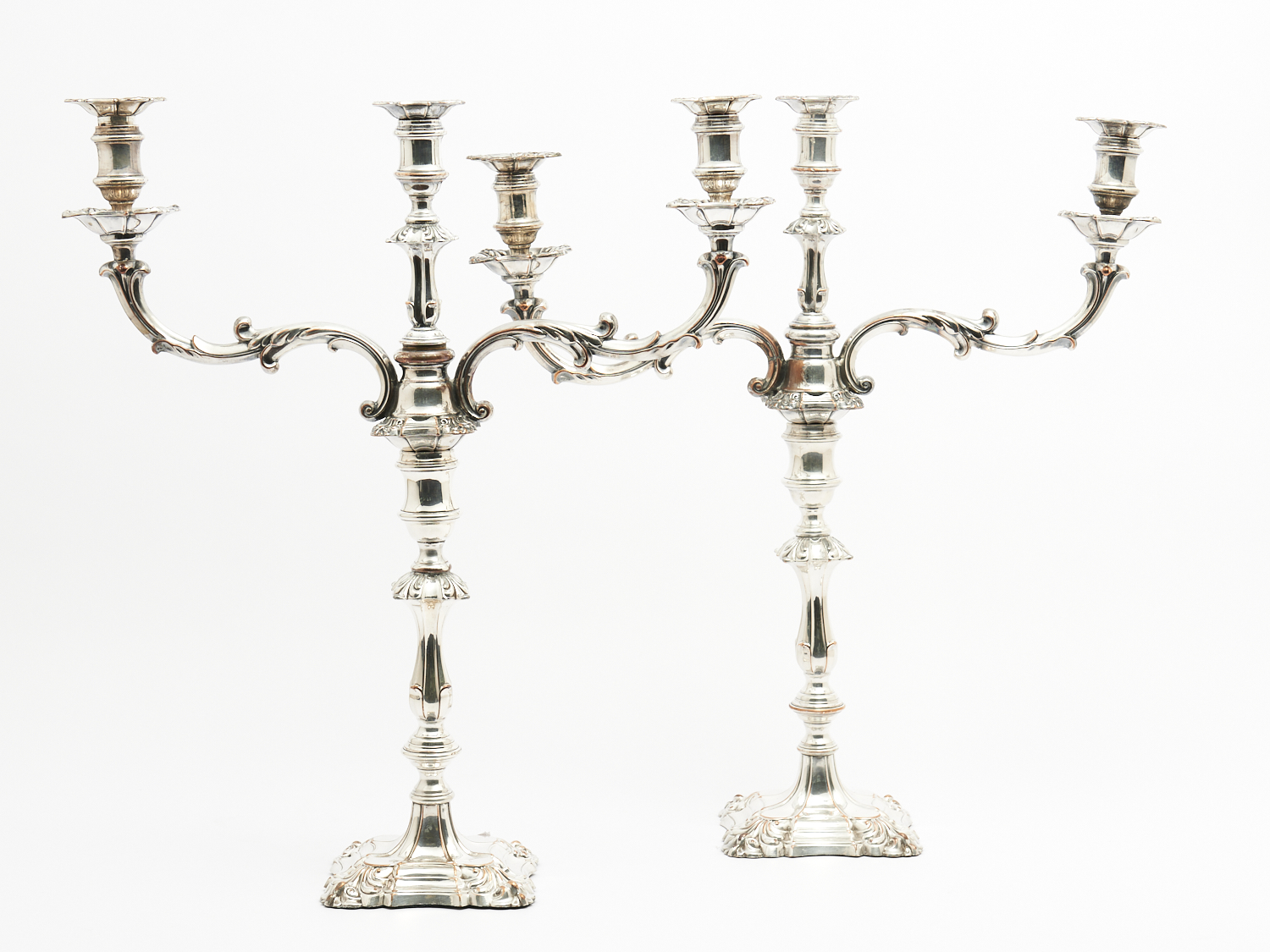 A PAIR OF DECORATIVE SILVER PLATE CANDELABRA H.49.5CM, LEONARD JOEL DELIVERY SIZE: MEDIUM