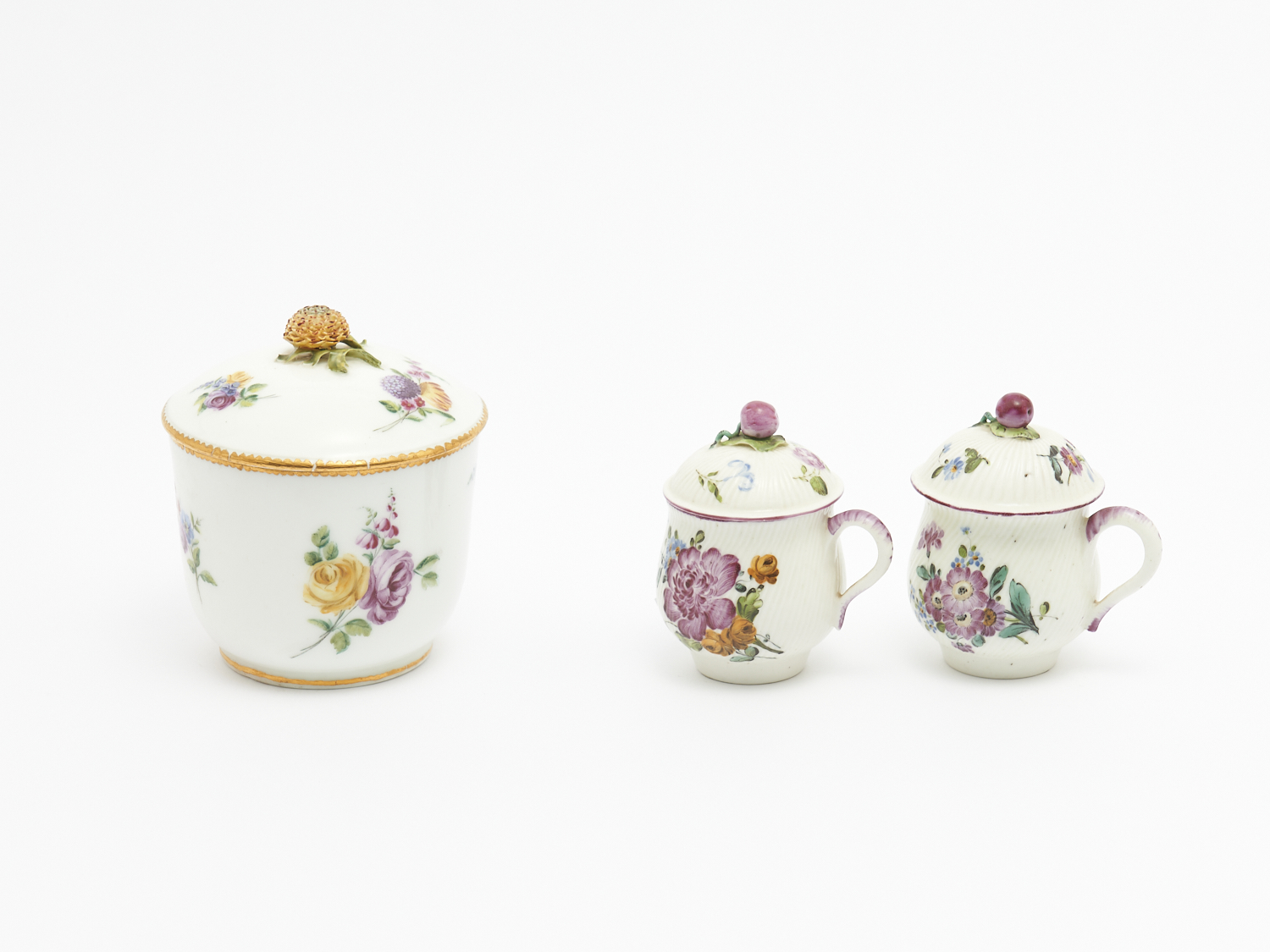 A SEVRES LIDDED JAM POT AND TWO PORCELAIN LIDDED CUPS WITH 'DV' INSCRIBED TO BASES H.11CM (TALLEST), LEONARD JOEL LOCAL DELIVERY: SMALL
