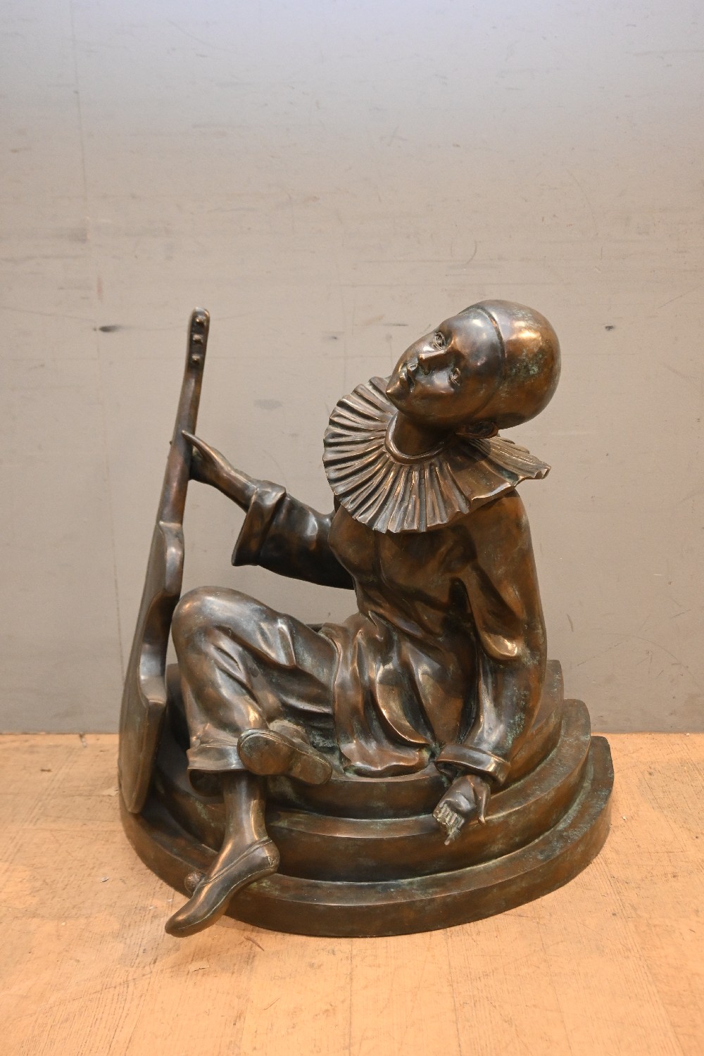 A LARGE 20th CENTURY BRONZE SCULPTURE OF A FEMALE PIERROT FIGURE HOLDING HER MANDOLIN, INDISTINCTLY SIGNED (70CM HIGH X 72CM WIDE X 44CM DEEP (PLEASE NOTE THIS HEAVY ITEM MUST BE REMOVED BY CARRIERS AT THE CUSTOMER'S EXPENSE. LEONARD JOEL STAFF CANNOT ASSIST CARRYING THIS ITEM) (LARGE ITEM)