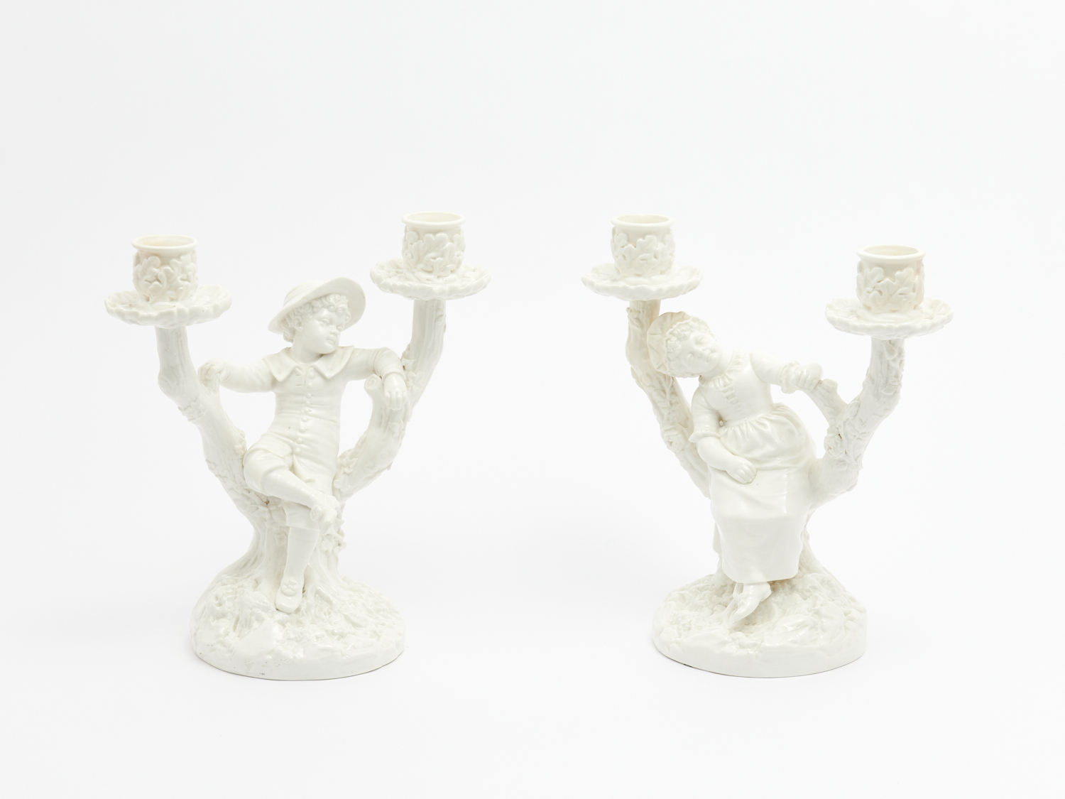 A PAIR OF ROYAL WORCESTER BLANC DE CHINE FIGURAL CANDELABRA (MINOR CHIPS) H.22CM, LEONARD JOEL LOCAL DELIVERY: SMALL