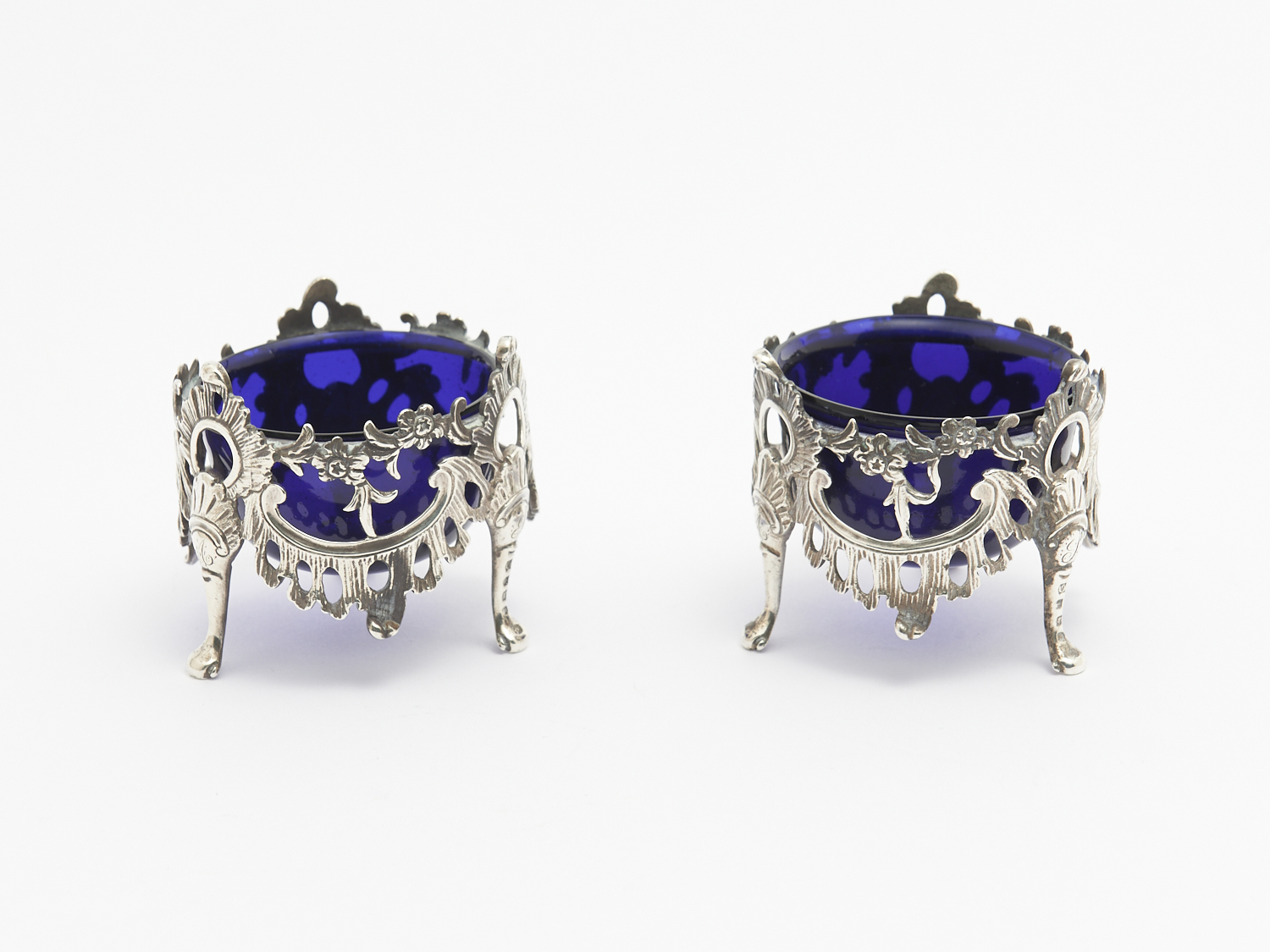 A PAIR OF CAST STERLING SILVER SALTS WITH BLUE GLASS LINERS, 1827 DIA.6CM 120G, LEONARD JOEL LOCAL DELIVERY: SMALL