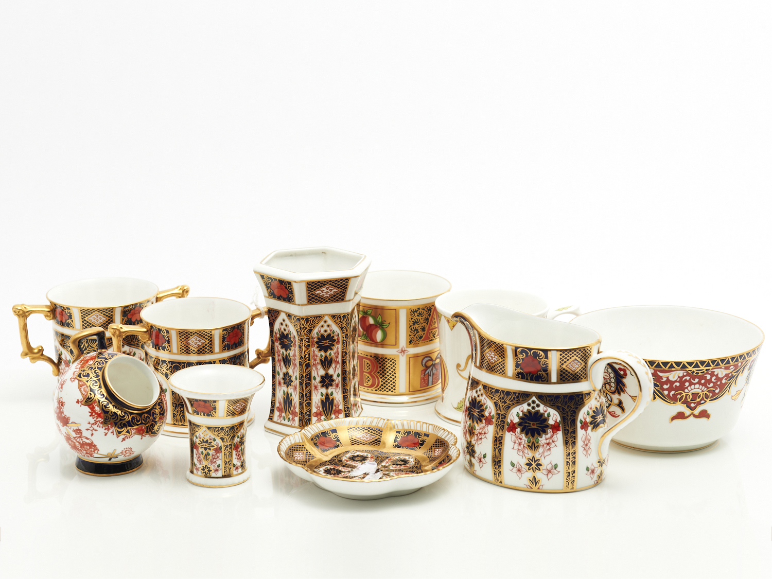 A COLLECTION OF ROYAL CROWN DERBY PORCELAIN INCLUDING TWIN HANDLED CUPS, JUG AND BOWL H.11.5CM (TALLEST), LEONARD JOEL LOCAL DELIVERY: MEDIUM