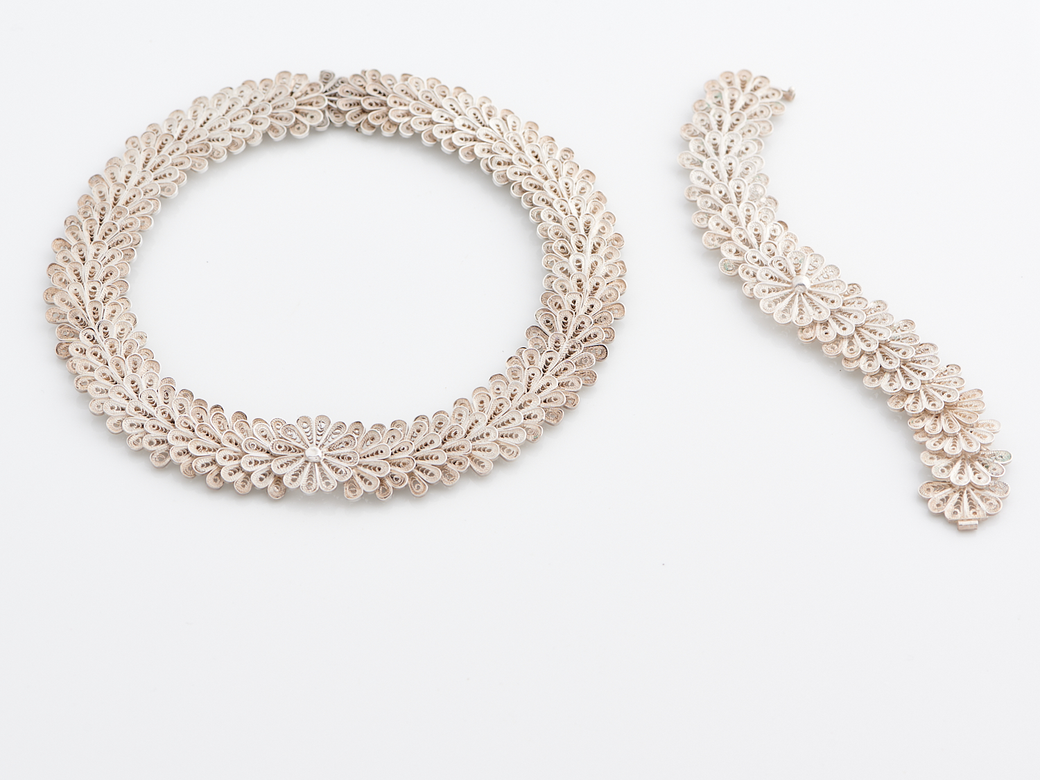A JEWELLERY SUITE IN SILVER, COMPRISING A BRACELET AND COLLAR, BRACELET LENGTH 167MM, NECKLACE LENGTH 370MM, 125.3GMS