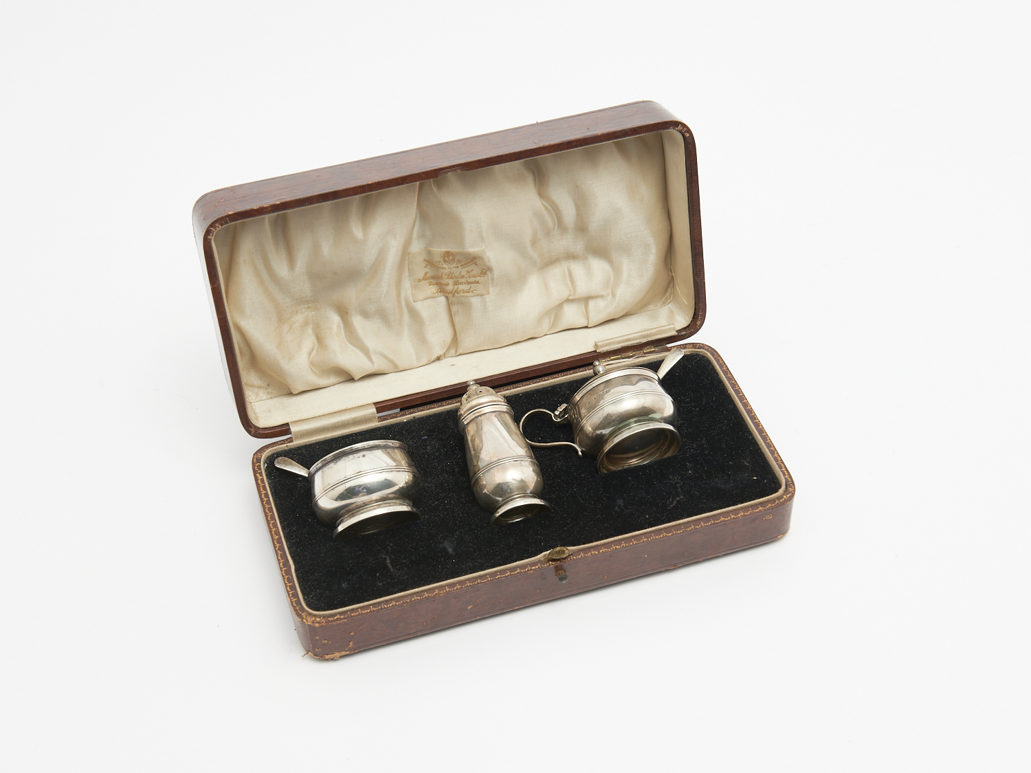 A BOXED STERLING SILVER SALT CELLARS AND SHAKER L.22CM 88G, LEONARD JOEL LOCAL DELIVERY: SMALL