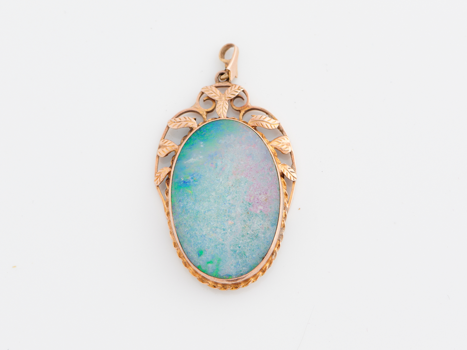 AN OPAL DOUBLET PENDANT IN 9CT GOLD, DROP LENGTH 40MM, 5.7GMS