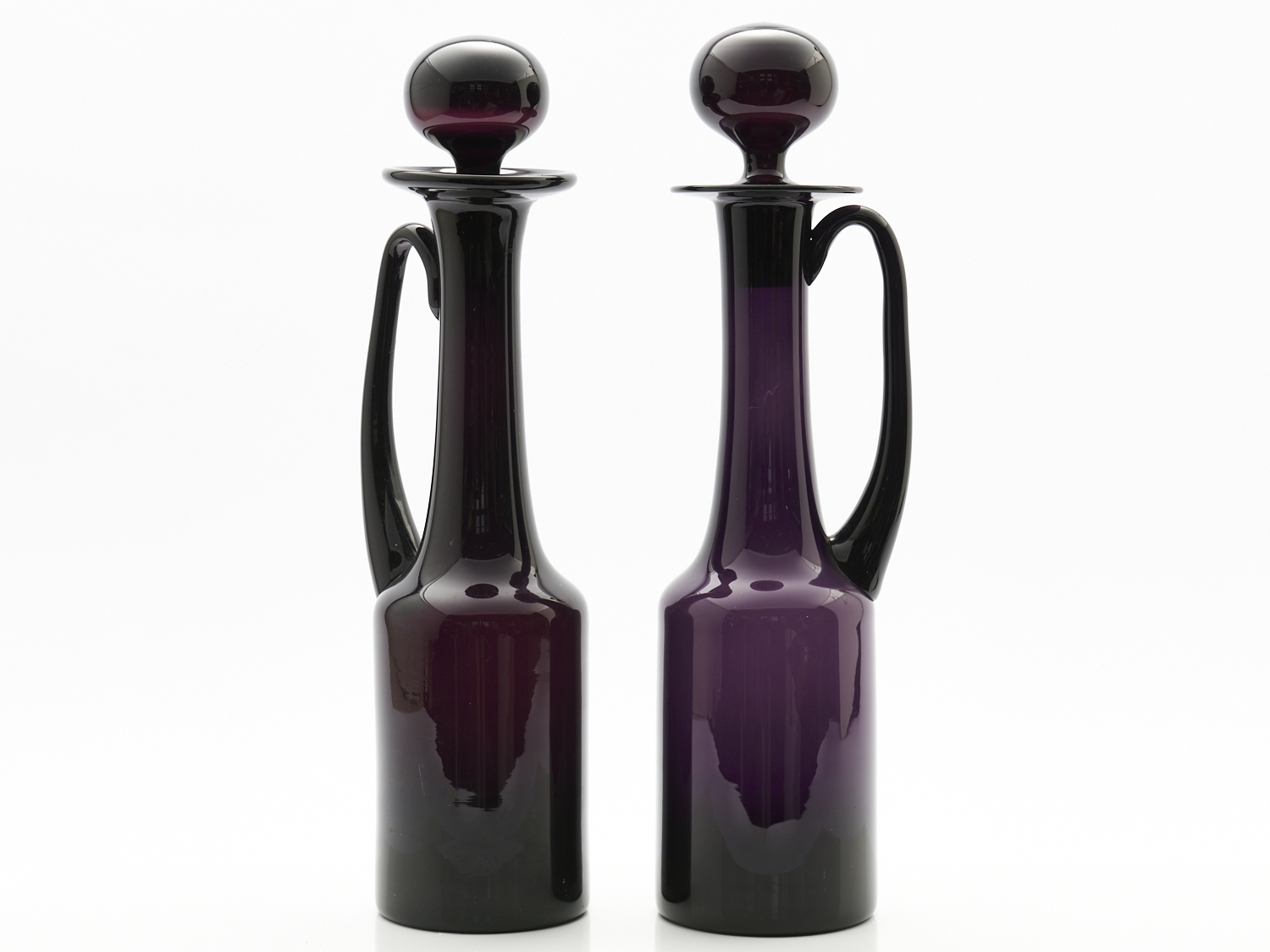 A PAIR OF PURPLE ART GLASS DECANTERS H.40CM, LEONARD JOEL LOCAL DELIVERY: MEDIUM