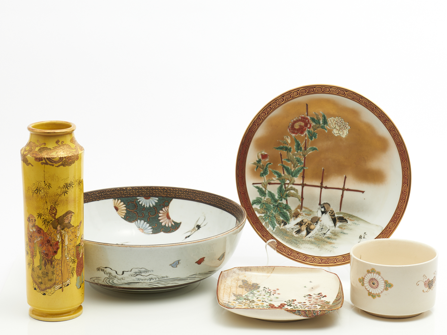 FOUR SATSUMA BOWLS, PLATES AND DISHES, AND A VASE ON A YELLOW GROUND DIA.27CM (LARGEST), LEONARD JOEL LOCAL DELIVERY: MEDIUM