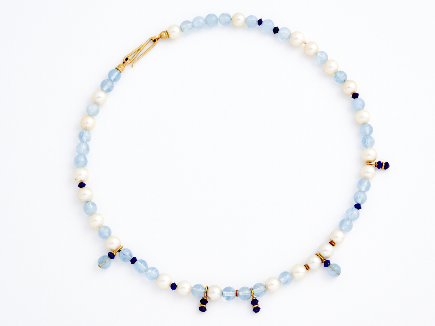 CHRISTINE HAFERMALZ WHEELER, A STRAND OF CULTURED PEARLS AQUAMARINE, LAPIS LAZULI BEADS, LENGTH 460MM