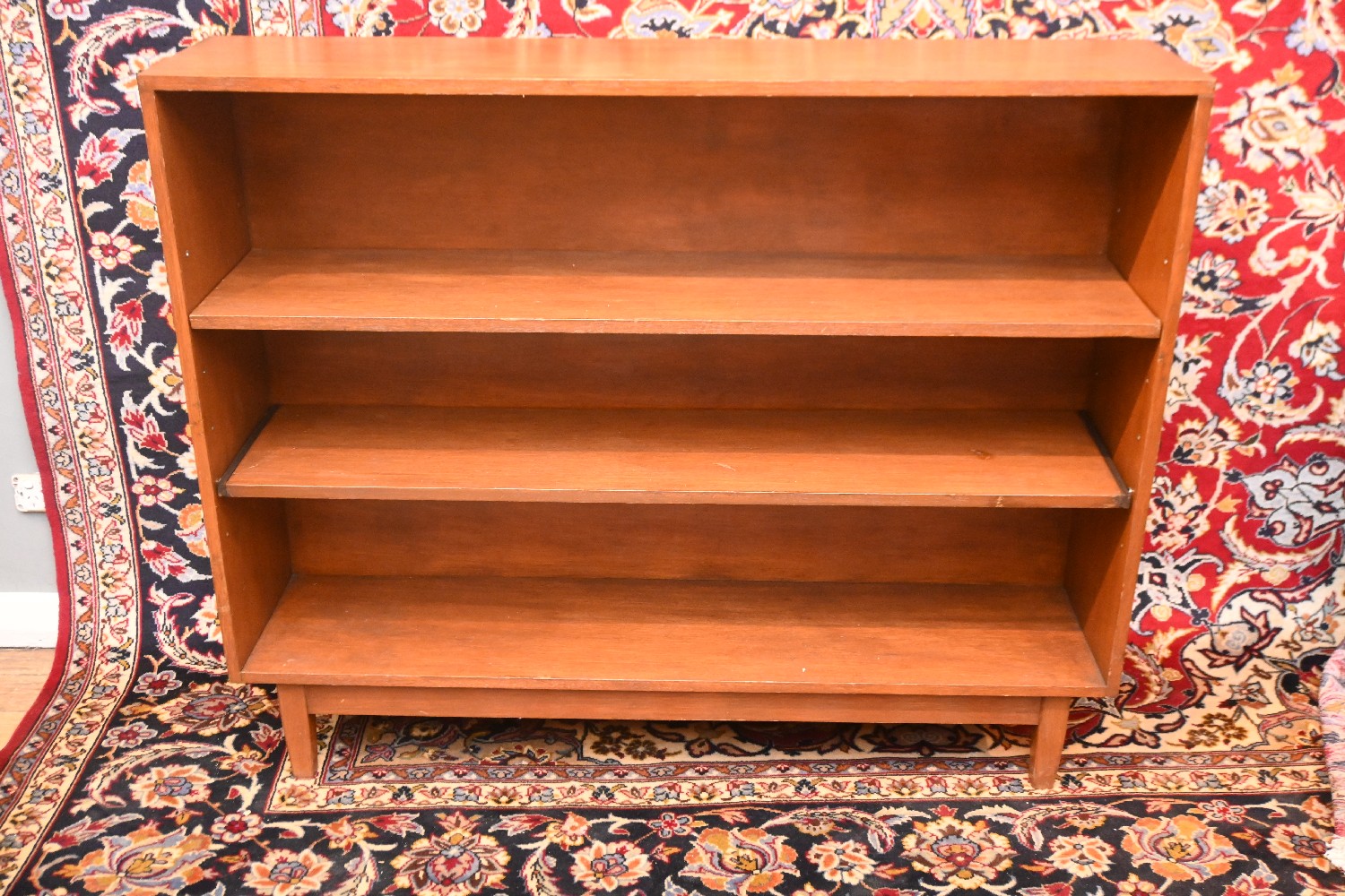 A RETRO TEAK THREE TIER BOOKSHELF (108H X 131W X 30D CM) (PLEASE NOTE THIS HEAVY ITEM MUST BE REMOVED BY CARRIERS AT THE CUSTOMER'S EXPENSE. LEONARD JOEL STAFF CANNOT ASSIST CARRYING THIS ITEM) (LARGE ITEM)