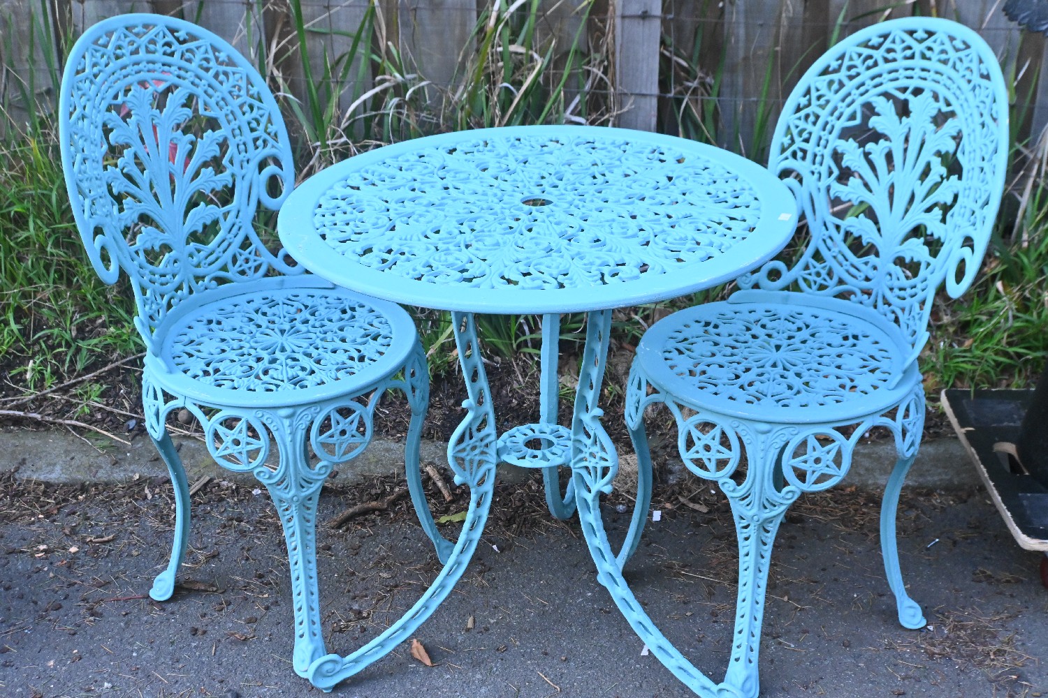 A VICTORIAN CAST METAL THREE PIECE OUTDOOR SETTING (67H X 64D CM) (LEONARD JOEL DELIVERY SIZE: LARGE)