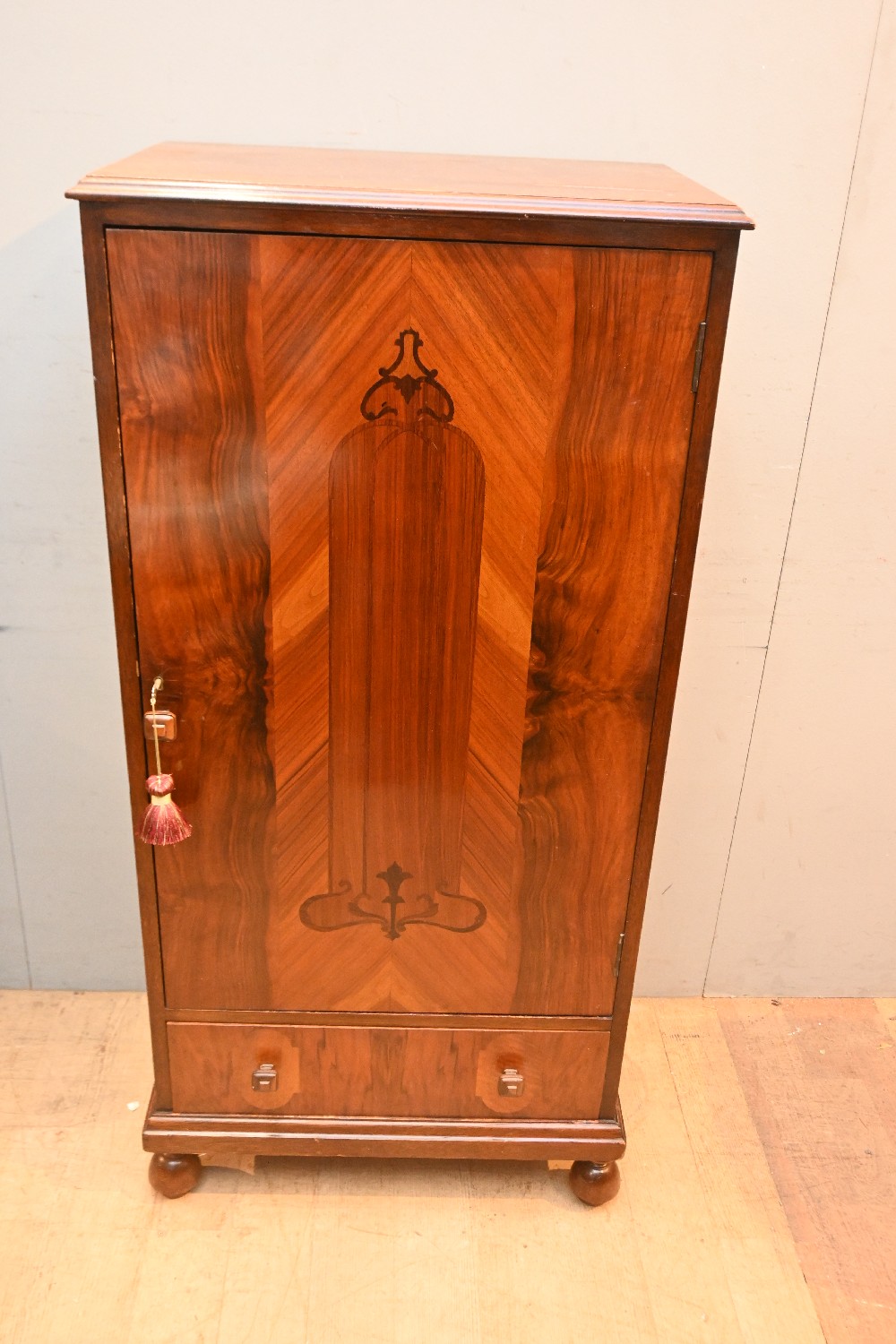 AN ART DECO INLAID GENTLEMAN'S CABINET - KEY IN OFFICE (130H X 62W X 40D CM) (PLEASE NOTE THIS HEAVY ITEM MUST BE REMOVED BY CARRIERS AT THE CUSTOMER'S EXPENSE. LEONARD JOEL STAFF CANNOT ASSIST CARRYING THIS ITEM) (LARGE ITEM)