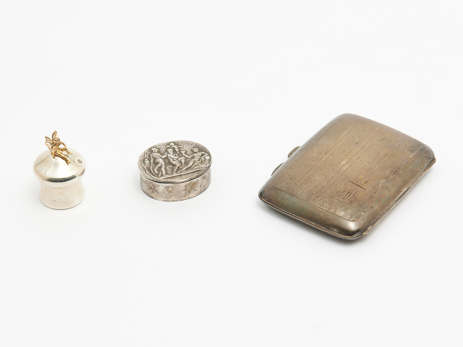 A STERLING SILVER CASE AND TWO CONTINENTAL AND STERLING SILVER PILL BOXES L.8CM (LONGEST) 94G, LEONARD JOEL DELIVERY SIZE: SMALL