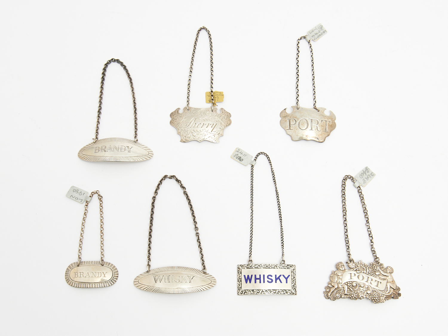 A GROUP OF STERLING SILVER DECANTER LABELS INCL. ONE WITHOUT VISIBLE HALLMARK L.6.5CM (LONGEST), LEONARD JOEL LOCAL DELIVERY: SMALL
