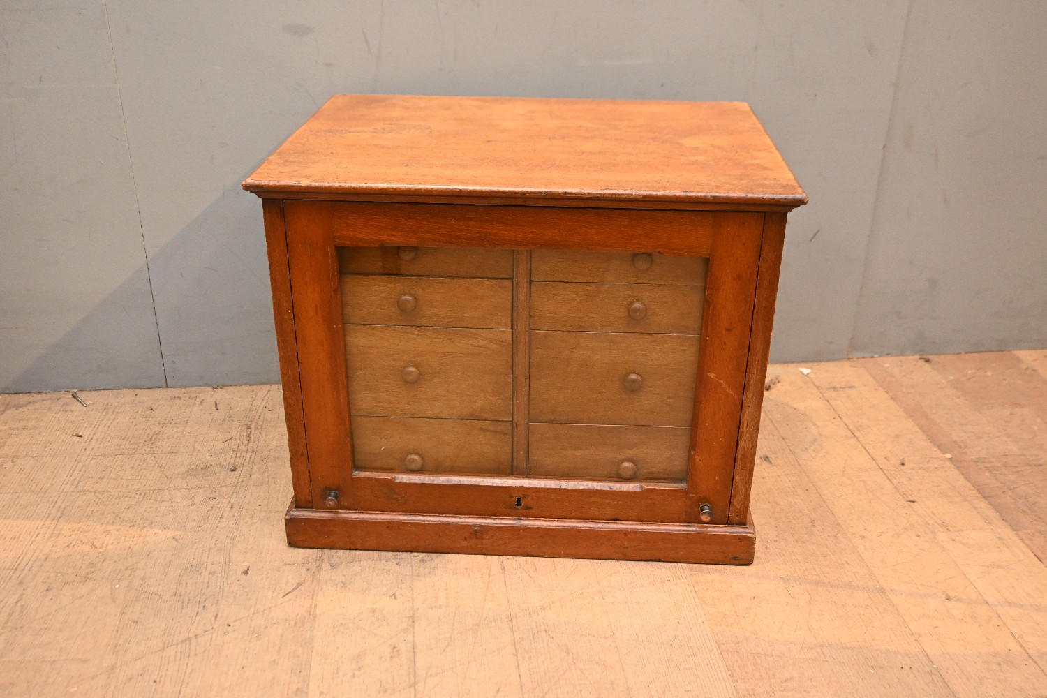 AN EARLY 20TH CENTURY GLASS FRONTED AUSTRALIAN SILKY OAK SPECIMEN CABINET WITH EIGHT DRAWERS (46H X 57W X 41D CM) (LEONARD JOEL DELIVERY SIZE: LARGE)