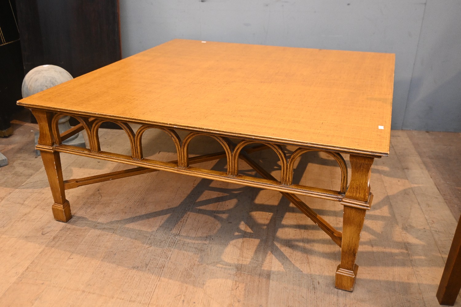 A LARGE 1970S ENGLISH WALNUT SQUARE COFFEE TABLE (A/F) (47H X 111W X 111D CM) (LEONARD JOEL DELIVERY SIZE: X-LARGE)