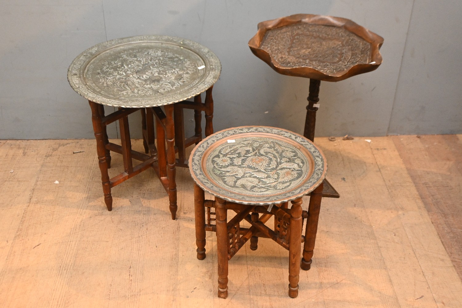 A GROUP OF THREE MIDDLE EASTERN TABLES, TWO WITH REMOVABLE TRAYS ON FOLDING TEAK BASES (57H X 43D CM) (LEONARD JOEL DELIVERY SIZE: LARGE)