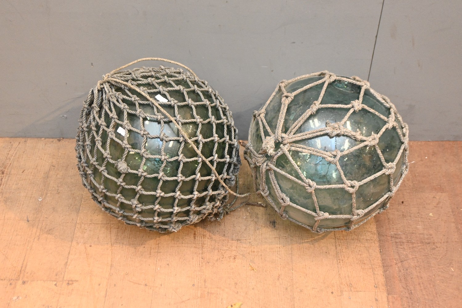 TWO LARGE 1920S GREEN GLASS SHIPPING FISHING BUOYS (38D CM) (LEONARD JOEL DELIVERY SIZE: LARGE)