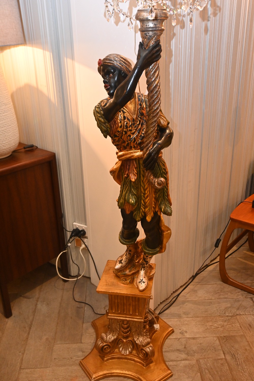 AN ITALIAN FLORENTINE BLACKAMOOR GILTWOOD AND CRYSTAL CHANDELIER FIGURAL STANDARD LAMP - TOP NOT SCREWED ON (A/F) (205H X 50W X 50D CM) (PLEASE NOTE THIS HEAVY ITEM MUST BE REMOVED BY CARRIERS AT THE CUSTOMER'S EXPENSE. LEONARD JOEL STAFF CANNOT ASSIST CARRYING THIS ITEM) (LARGE ITEM)