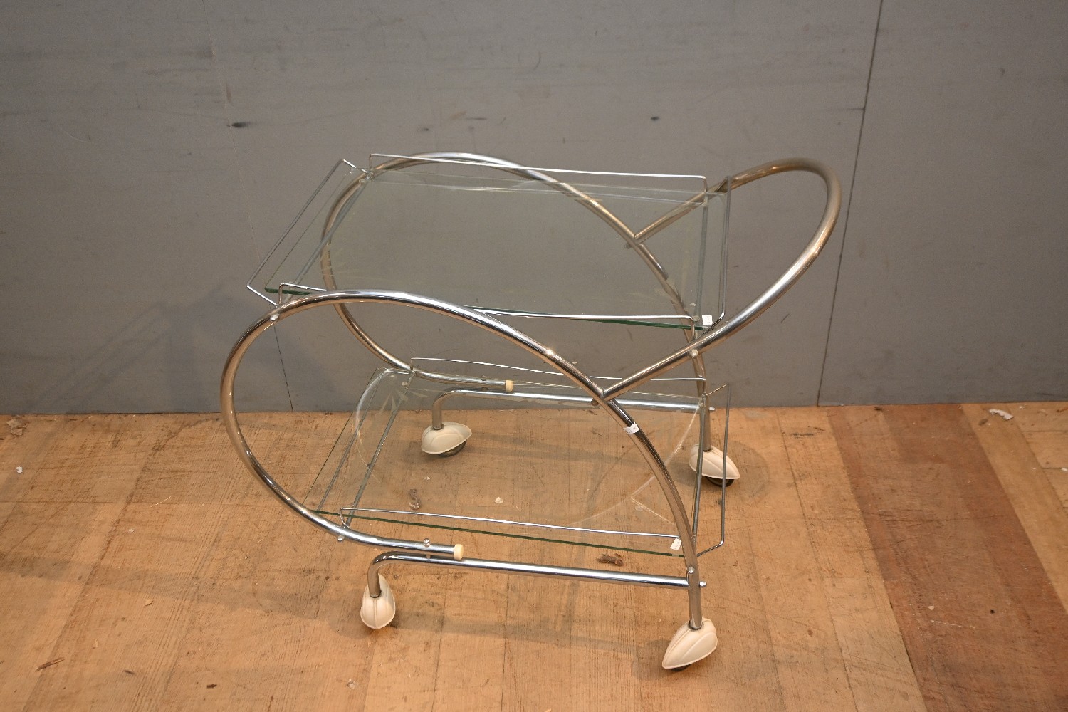 AN ART DECO CHROMED TWO TIER AUTO TROLLEY WITH ORIGINAL BAKELITE WHEEL COVERS AND ETCHED GLASS SHELVES (A/F) (75H X 80W X 44D CM) (LEONARD JOEL DELIVERY SIZE: LARGE)