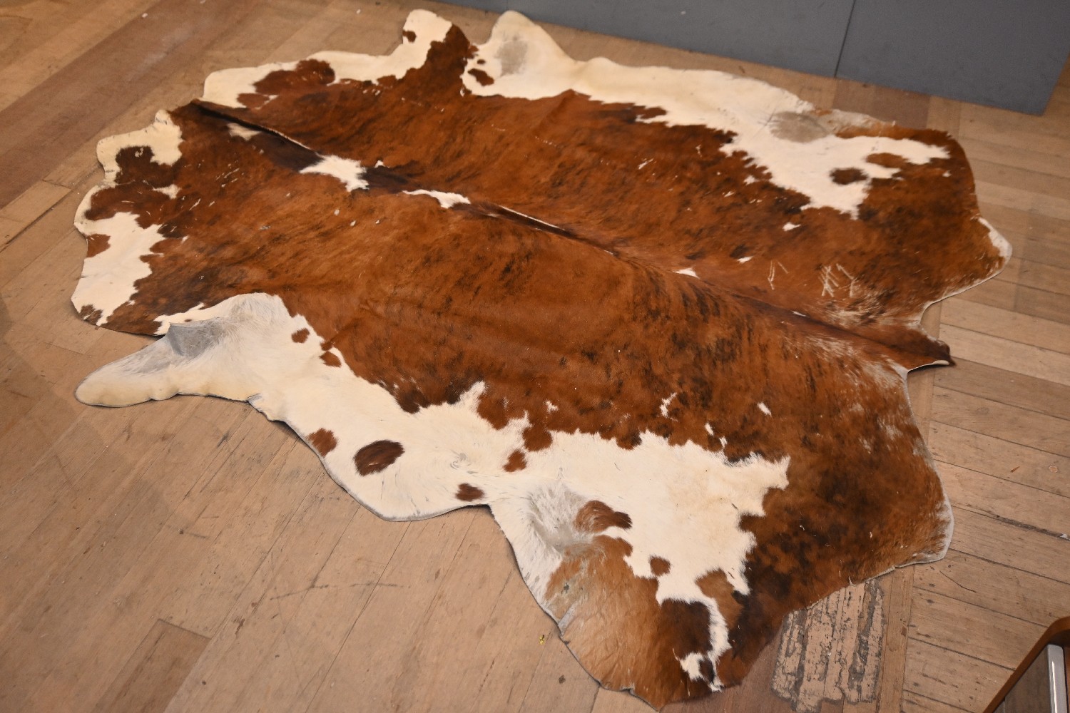 A LARGE BROWN AND WHITE COW HIDE RUG (A/F) (230 X 210 CM) (LEONARD JOEL DELIVERY SIZE: X-LARGE)