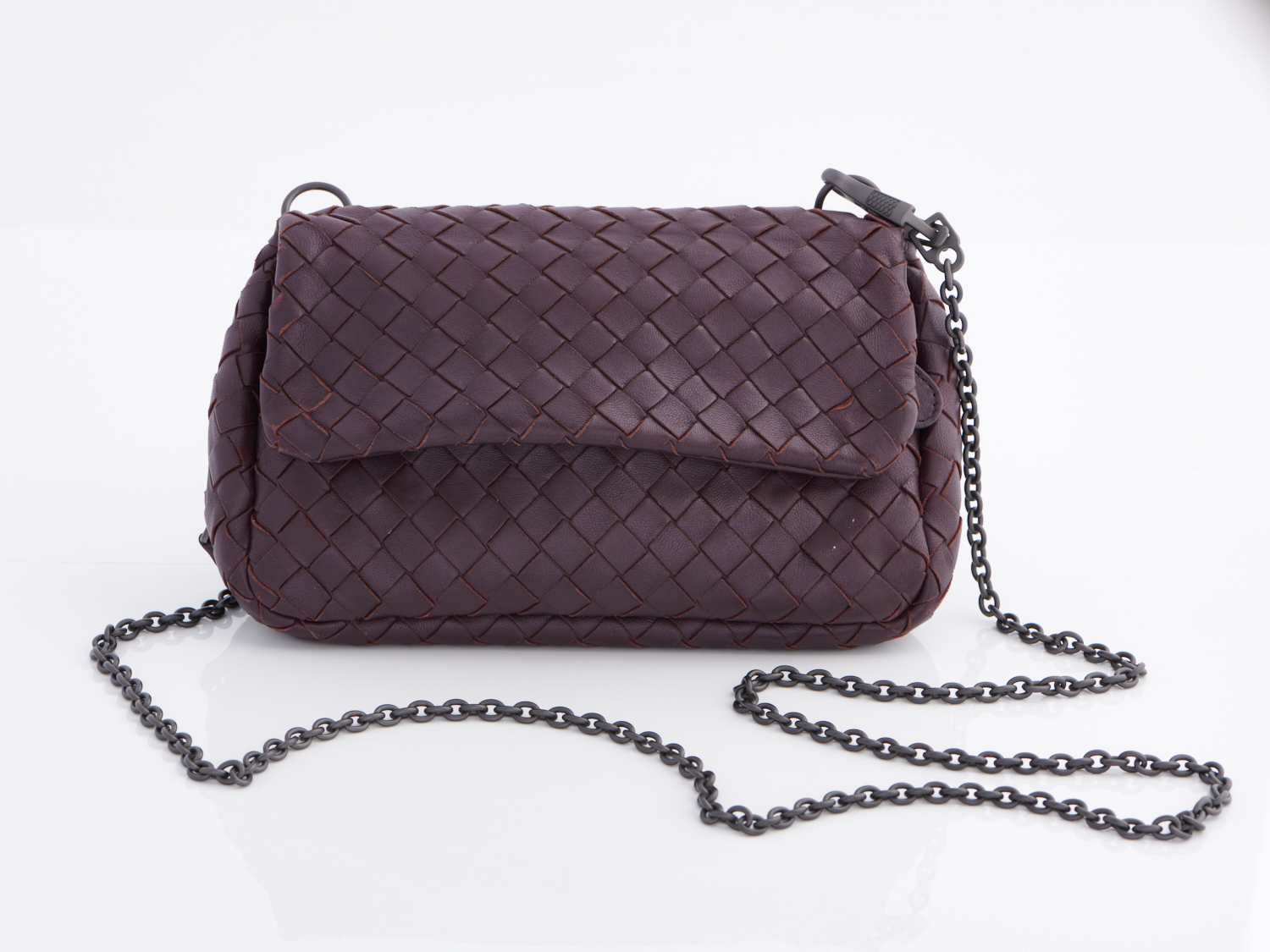 Styled in burgundy intrecciato leather with gunmetal hardware and optional shoulder strap, 22 x 15 x 6cm.