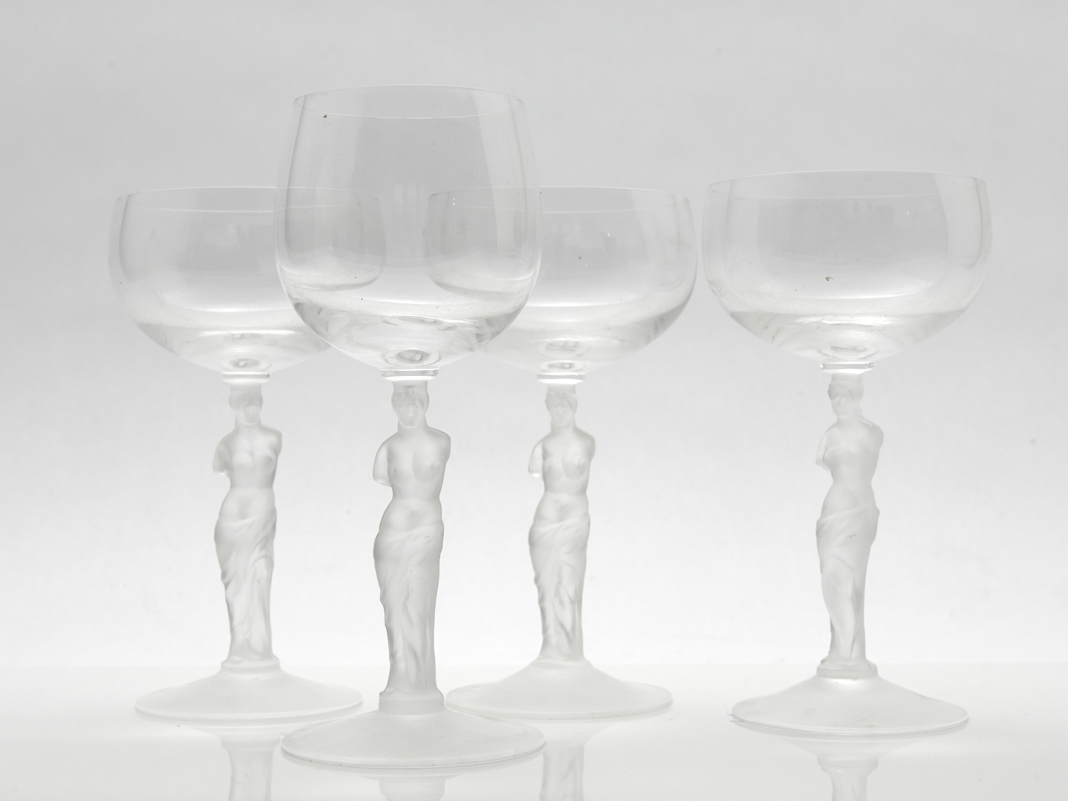 FOUR BACCHUS STYLE FROSTED FIGURAL STEM GLASSES H.18.5CM (TALLEST), LEONARD JOEL LOCAL DELIVERY: SMALL