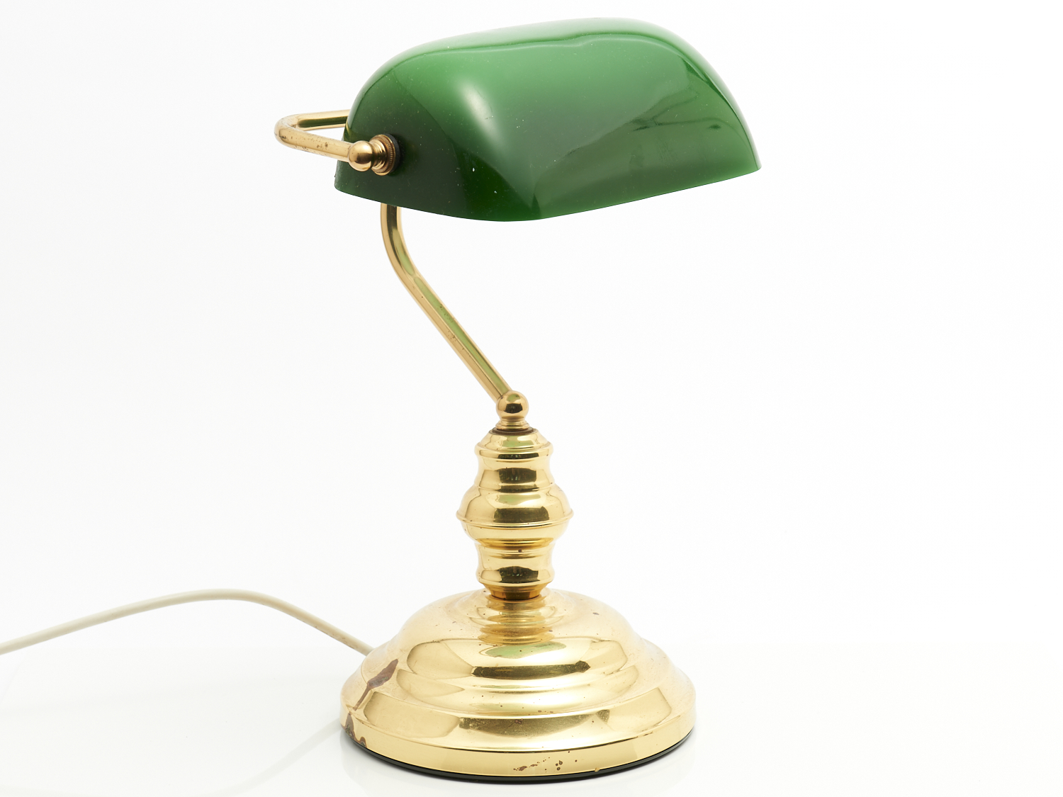 A BRASS BANKERS LAMP WITH A CASED GREEN GLASS SHADE H.40CM, LEONARD JOEL LOCAL DELIVERY: MEDIUM