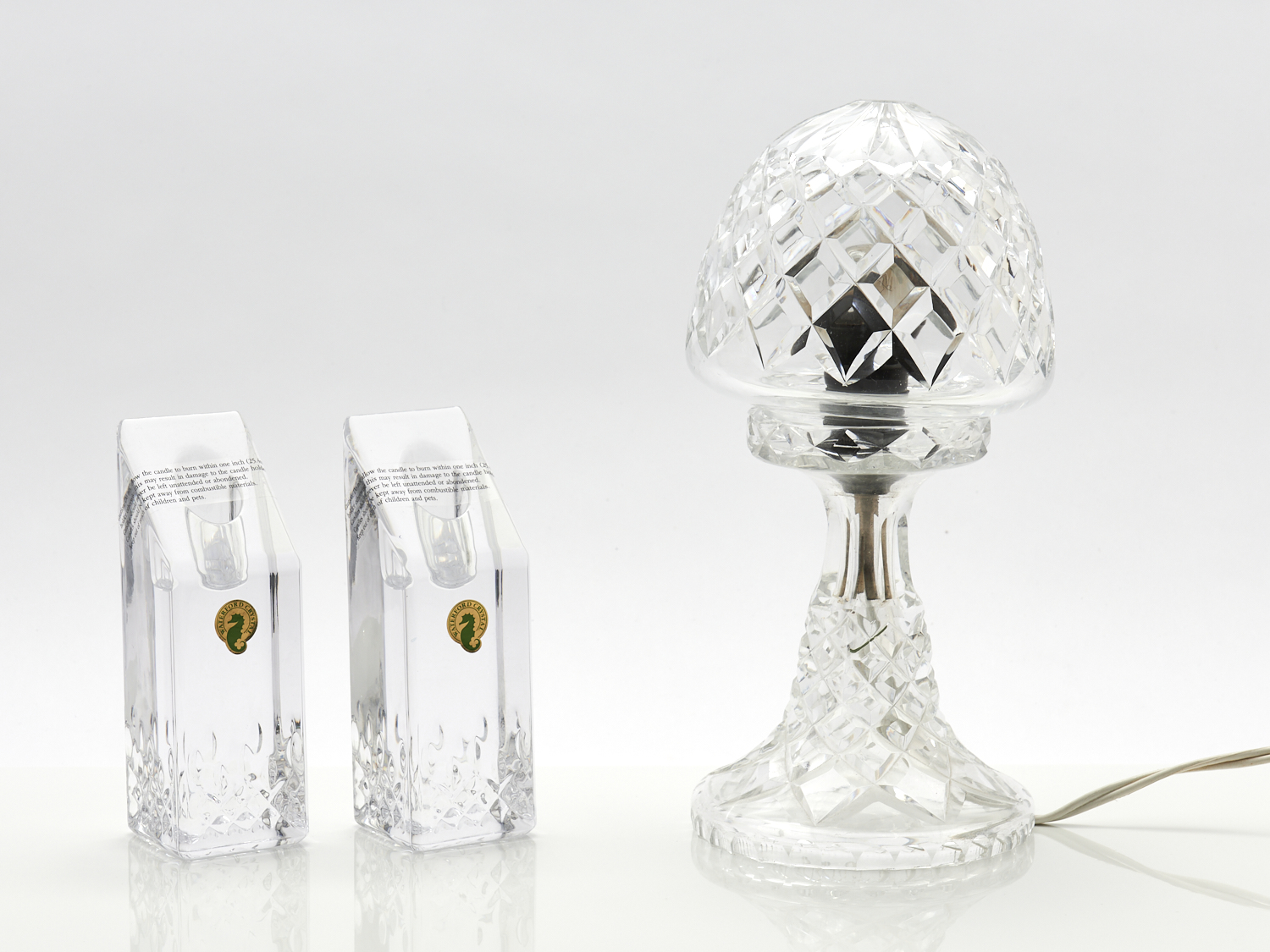 A PAIR OF WATERFORD CRYSTAL CANDLESTICKS AND A WATERFORD STYLE CRYSTAL LAMP H.27CM (LAMP), LEONARD JOEL LOCAL DELIVERY: MEDIUM
