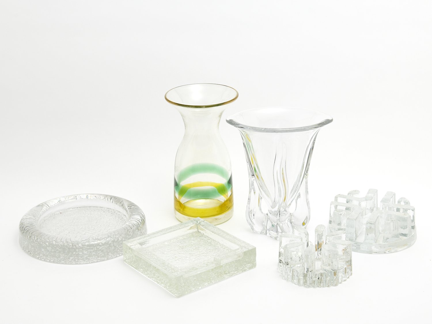 A GROUP OF GLASS VASES, DISHES AND CANDLE HOLDERS INCLUDING ORREFORS H.23CM, LEONARD JOEL LOCAL DELIVERY MEDIUM