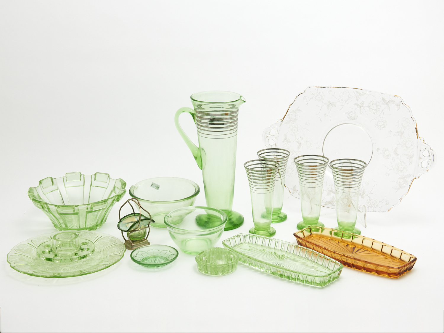 A LARGE GROUP OF PRIMARILY URANIUM GLASS INCLUDING A DECANTER AND GLASS SET H.30CM (LARGEST)