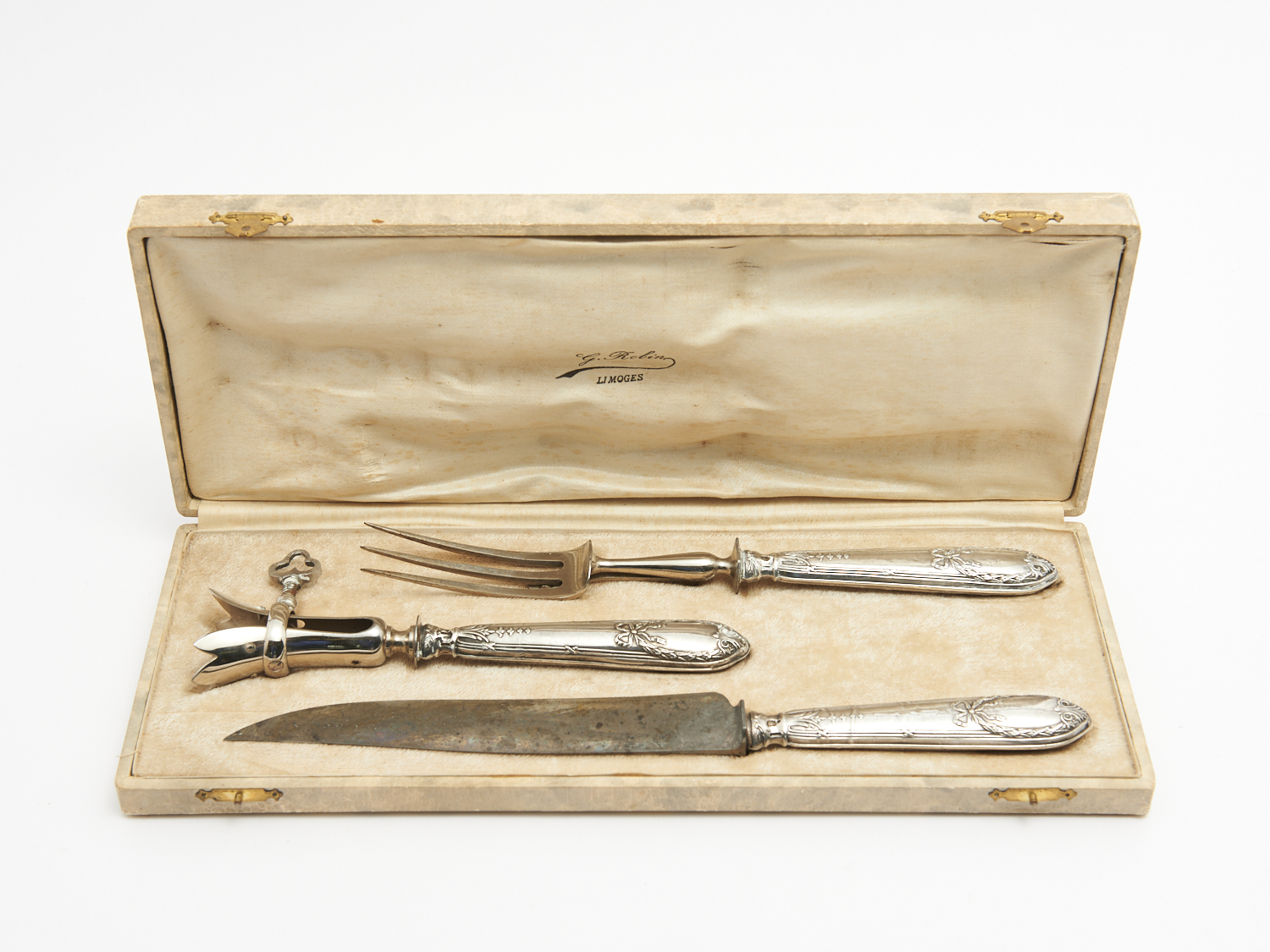 A BOXED LIMOGES THREE PIECE SILVER-HANDLED CARVING SET INCLUDING A BONE HOLDER, CARVING KNIFE AND FORK L.38CM (BOX), LEONARD JOEL DELIVERY SIZE: SMALL