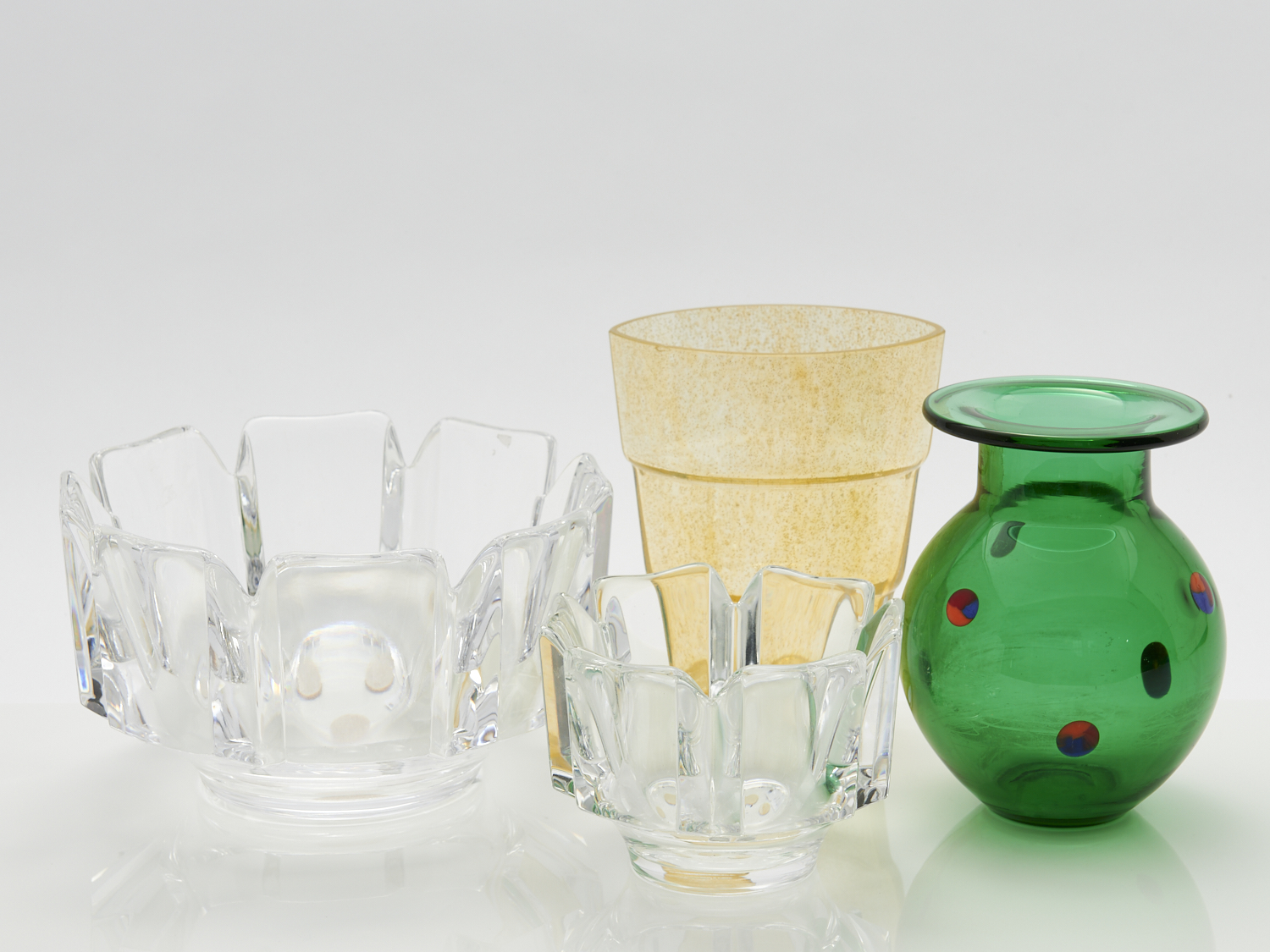 A SCANDINAVIAN ART GLASS LOT WITH A 'MEZZO' VASE BY ANN WAHLSTROM FOR KOSTA BODA, A 'PEPPERONI' VASE BY ERIKA LAGERBIELKE FOR ORREFORS AND A PAIR OF 'CORONA' BOWLS BY LARS HELLSTEN FOR ORREFORS DIA.18.5CM (LARGEST), LEONARD JOEL LOCAL DELIVERY: SMALL
