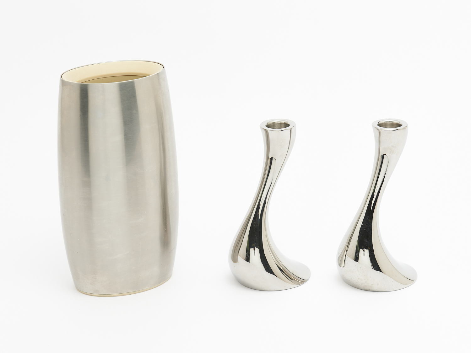 A TRIO OF GEORG JENSEN INCLUDING A PAIR OF 'COBRA' CANDLE STICKS TOGETHER WITH A 'SAKURA' VASE BY HIROMICHI KONNO H.22CM (TALLEST), LEONARD JOEL LOCAL DELIVERY: SMALL