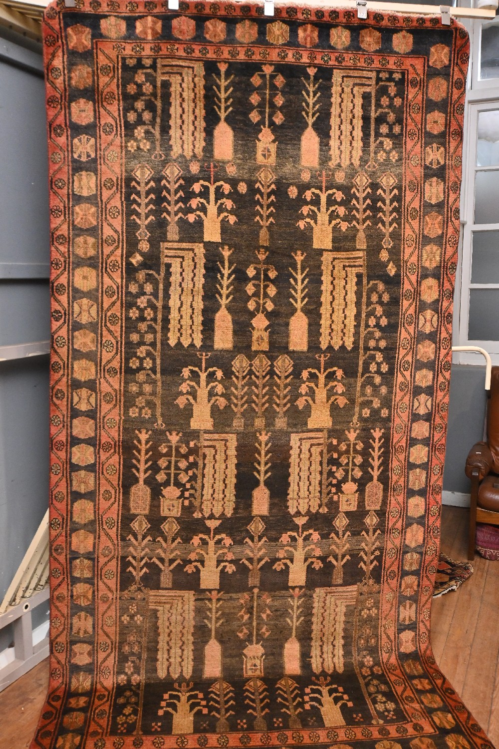 A 1970'S PERSIAN TAJABAD NOMADIC RUG. 100% SEMI VINTAGE WOOL PILE, NATURAL DYES. ALL OVER DESIGN OF TRIBAL TREE AND FLORAL MOTIFS OF LADIK, HYACINTH, AND TREE OF LIFE ON A CHARCOAL FIELD. COLOURFUL BORDERS OF AMULETS AND ROSETTES. NATURAL ABRASH. SIZE: 307 X 152 CM. ORIGIN: PERSIA. RRP: $2,500. DOCUMENTATION OF AUTHENTICITY INCLUDED