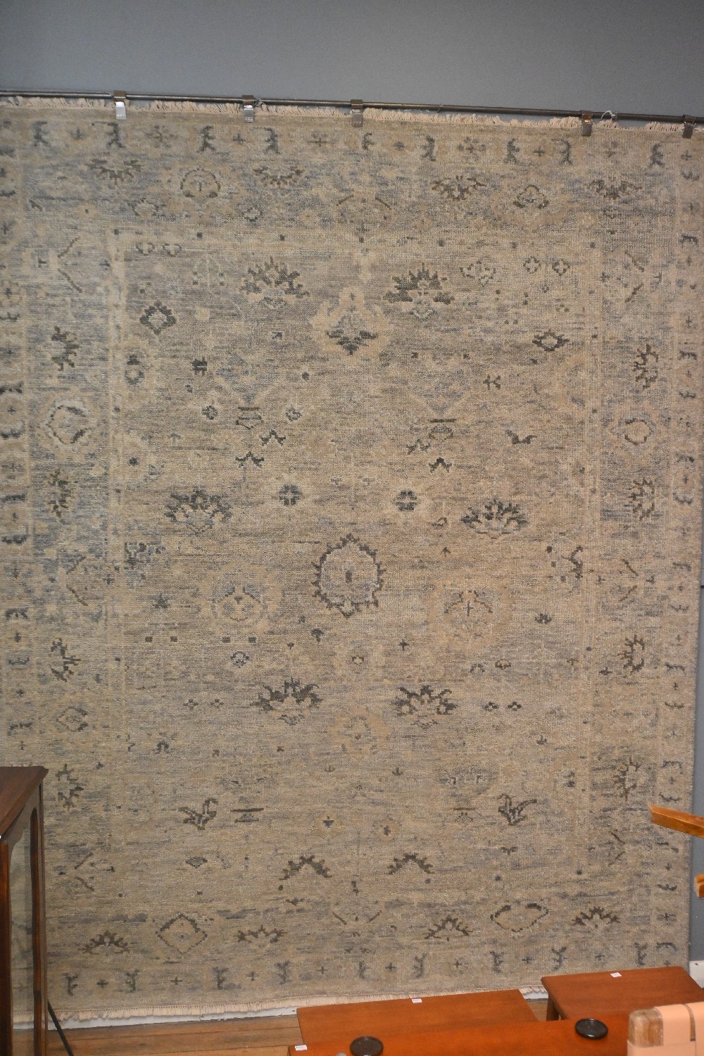 A BRAND-NEW HAND KNOTTED ANTIQUE 16TH CENTURY USHAK DESIGN RUG. 100% WOOL AND NATURAL DYES. WITH AN ALL-OVER DESIGN, IN CONTEMPORARY MODERN COLOUR TONES OF GREY, CREAM AND CHARCOAL TONES. SIZE: 306 X 251 Cm. ORIGIN: AGRA - RRP: $3,200. DOCUMENTATION OF AUTHENTICITY INCLUDED