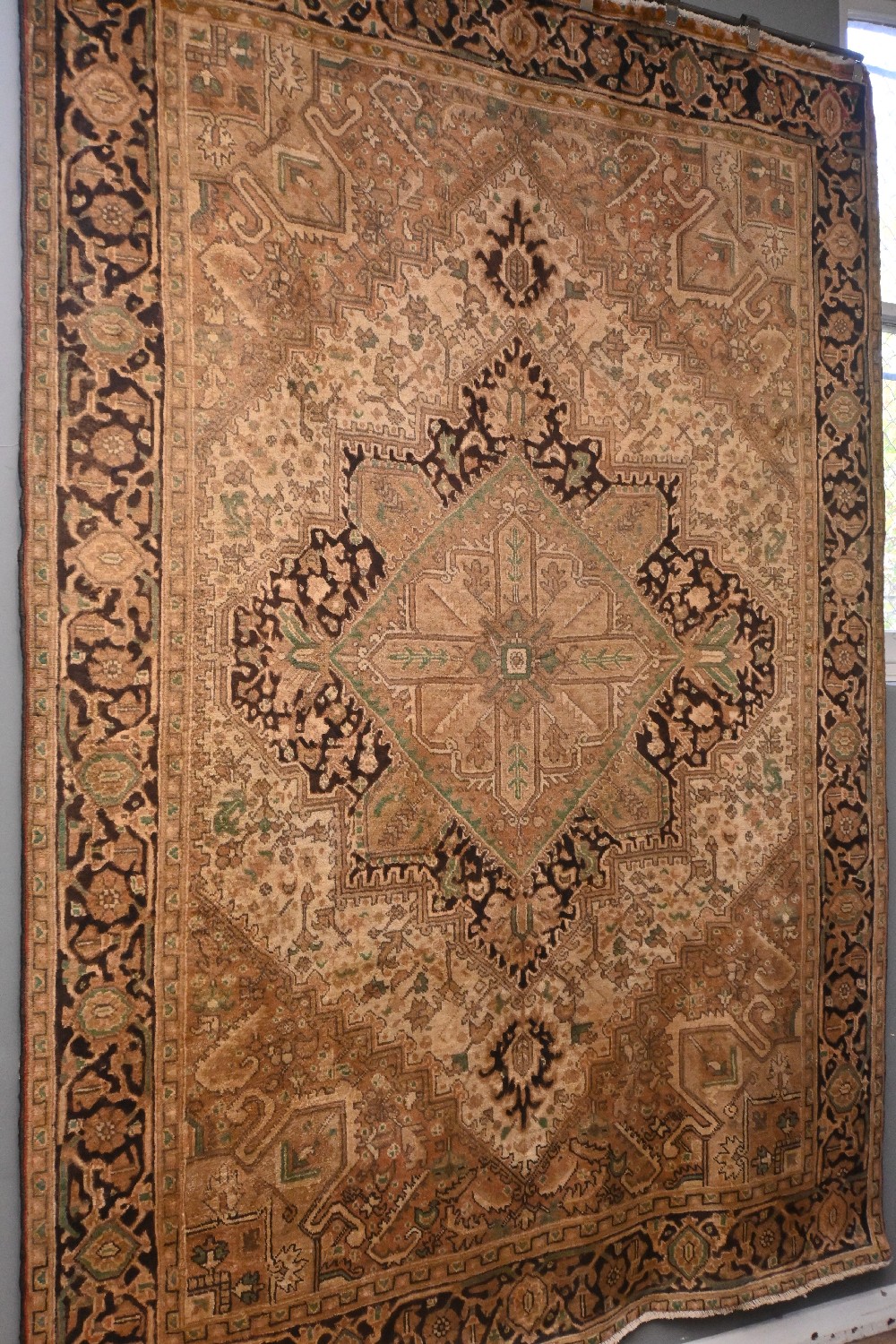 A DECORATIVE HERIZ CARPET. 100% WOOL, SOLID AND DENSE, NATURAL DYES. HAND-WOVEN IN THE VILLAGES OF THE HERIZ REGION, AN IMPORTANT CARPET-PRODUCING REGION OF AZERBAIJAN PROVINCE WITH TRADITIONAL DESIGN OF BOLD DOMINANT DIAMOND-SHAPED MEDALLION & QUARTERED CORNER MEDALLIONS IN ALL OVER TONES OF TAN, CHOCOLATE AND HINTS OF GREEN OF PALMETTES & OAK LEAVES. BORDER OF TRIBAL PATTERNS. SIZE: 296 X 207 CM. ORIGIN: IRAN - RRP: $4,900. DOCUMENTATION OF AUTHENTICITY INCLUDED