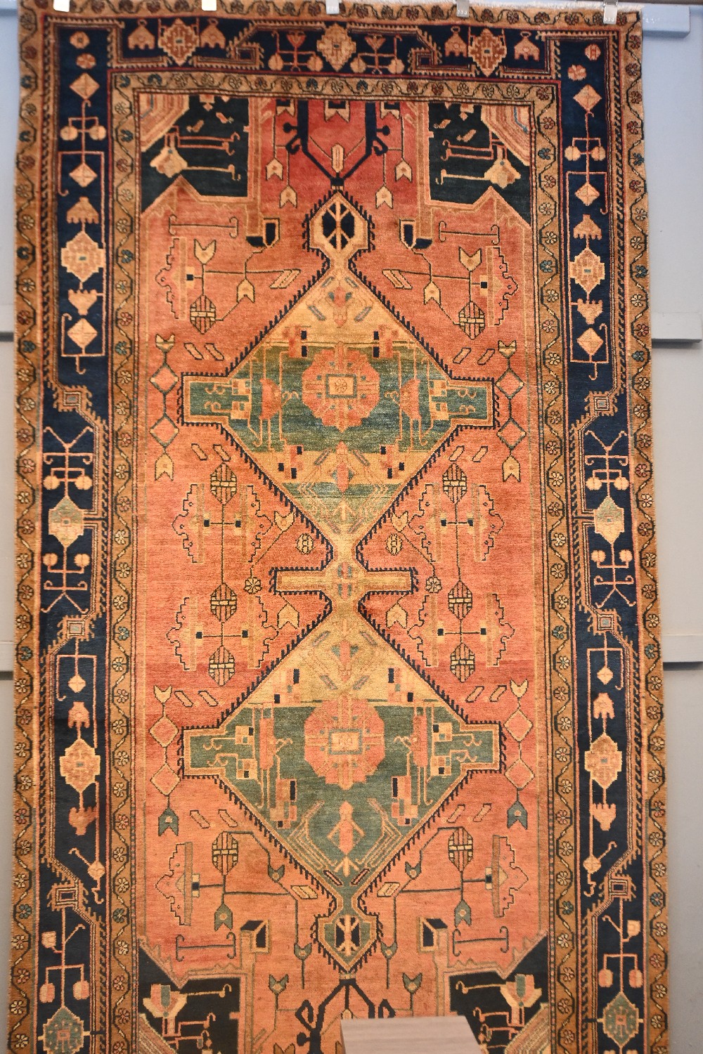 A DECORATIVE 1970'S KAKABERU PERSIAN RUG. 100% WOOL, ORGANIC DYES, SEMI VINTAGE PILE. WOVEN BY KURDISH NOMADS FROM NORTHWEST IRAN. CENTRAL DOUBLE DIAMOND ANCHORED MEDALLIONS CONTAINING TRIBAL MOTIFS IN RARE COLOUR TONES OF PEACH AND PALE BLUE. ON A SOFT RED FIELD OF DECORATIVE TRIBAL MOTIFS. FABULOUS BORDER OF ROSETTES AND TRIBAL MOTIFS IN AN INK BLUE HUE. SIZE: 189 X 156 CM. ORIGIN: PERSIA - RRP: $3,100. DOCUMENTATION OF AUTHENTICITY INCLUDED