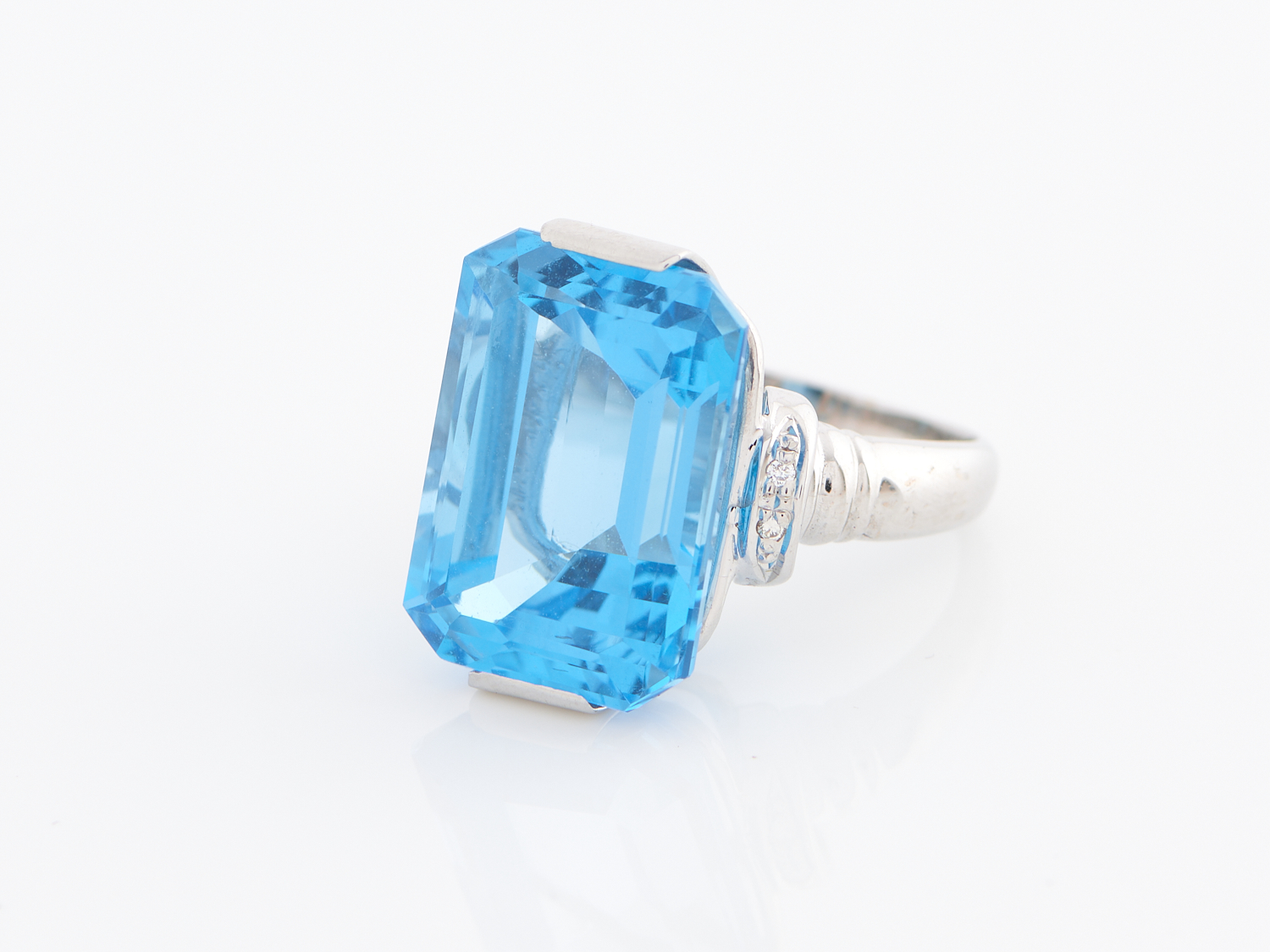 A TOPAZ AND DIAMOND RING IN 18CT WHITE GOLD, THE TOPAZ WEIGHING APPOXIMATELY 19CTS, SIZE M, 10GMS, ACCOMPANIED BY A COPY OF A VALUATION