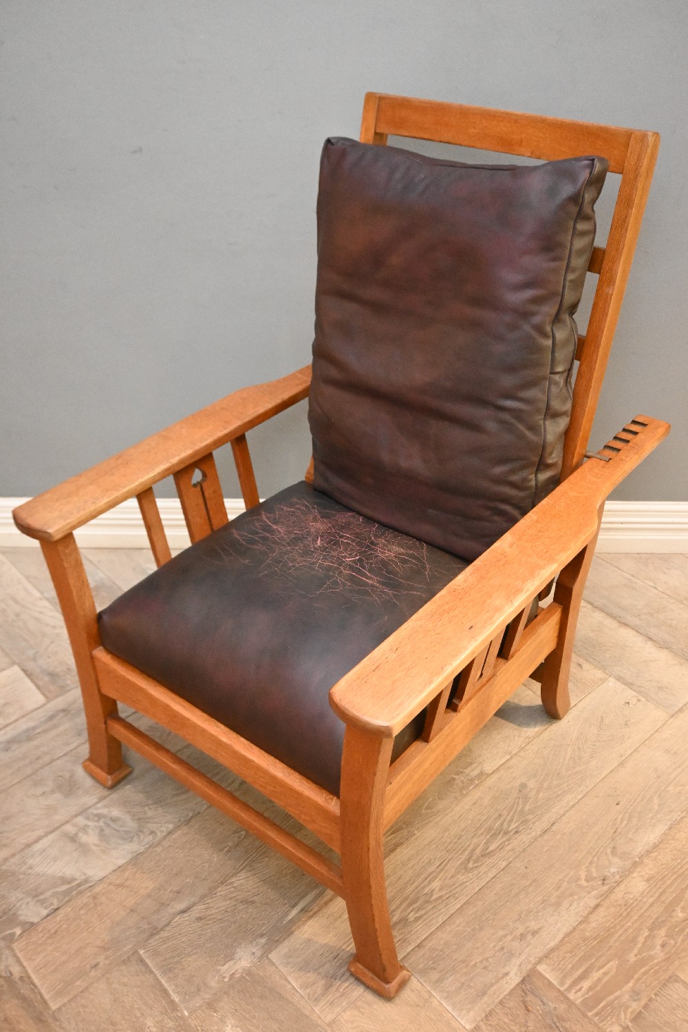 AN EARLY 20th CENTURY ARTS AND CRAFTS OAK MORRIS-TYPE ADJUSTABLE ARMCHAIR, THE CUSHIONS IN CHOCOLATE BROWN LEATHER (SOME WEAR TO LEATHER) (110H X 75W X 90D CM) (LEONARD JOEL DELIVERY SIZE: X-LARGE)