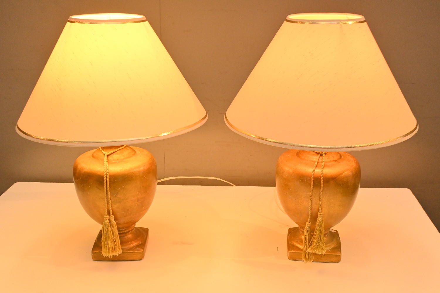 A PAIR OF CERAMIC GILT TABLE LAMPS (53H X 39D CM) (LEONARD JOEL DELIVERY SIZE: LARGE)