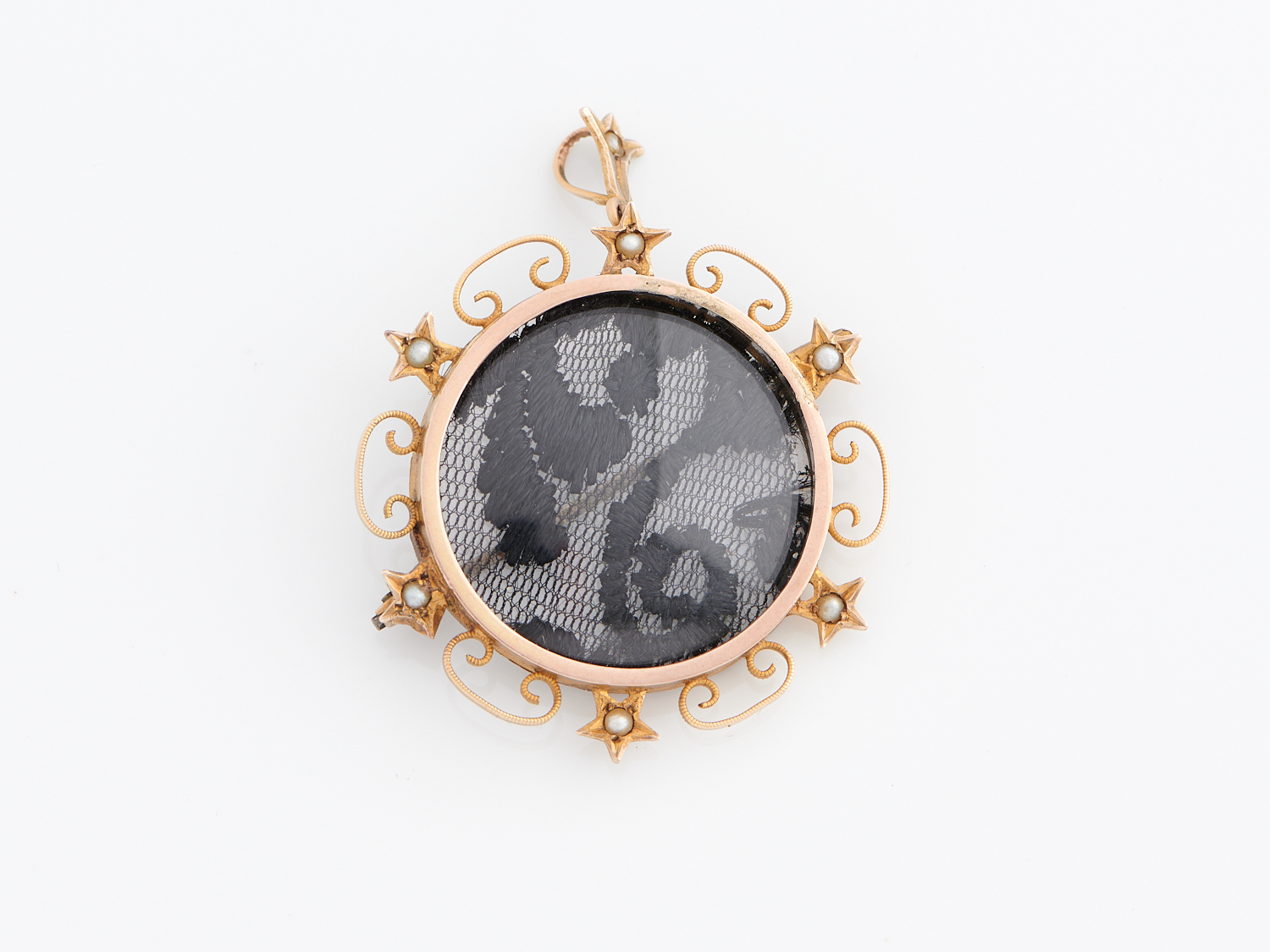 AN ANTIQUE AUSTRALIAN PEARL AND BLACK LACE LOCKET IN 9CT GOLD, DIAMETER 39MM