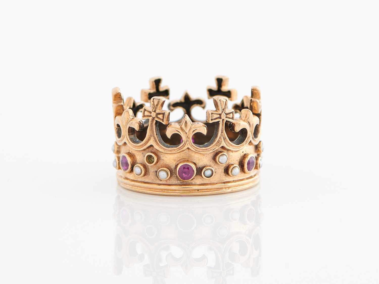 A RUBY AND PEARL CORONATION RING IN 9CT GOLD, RING SIZE P