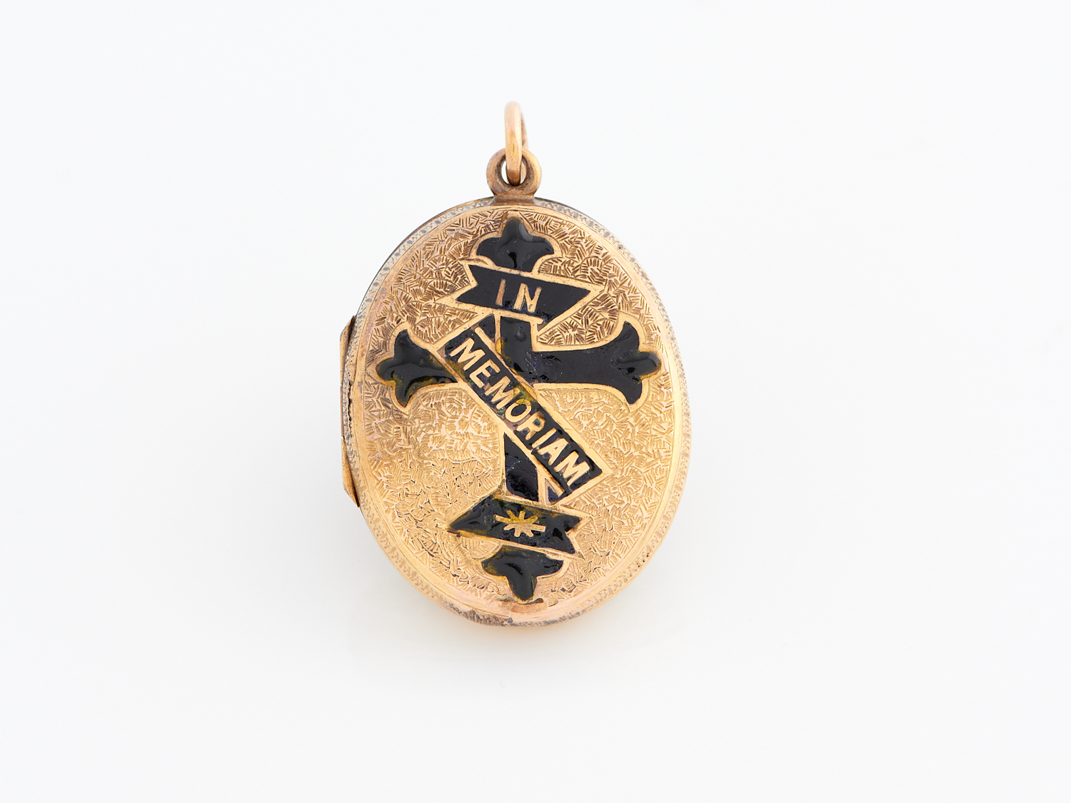 A MOURNING LOCKET IN 18CT GOLD, FEATURING BLACK ENAMEL DETAIL, 33 X 26MM, 8.1GMS