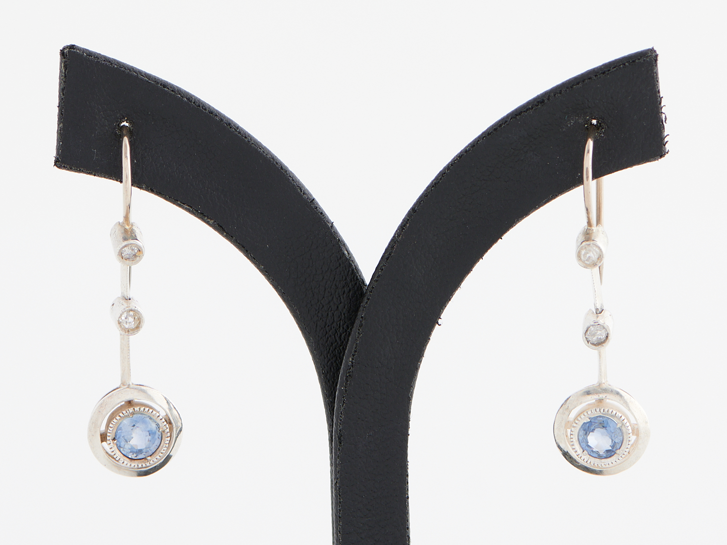 A PAIR OF DECO STYLE SAPPHIRE AND DIAMOND DROP EARRINGS IN SILVER, TO SHEPHERD HOOK FITTINGS